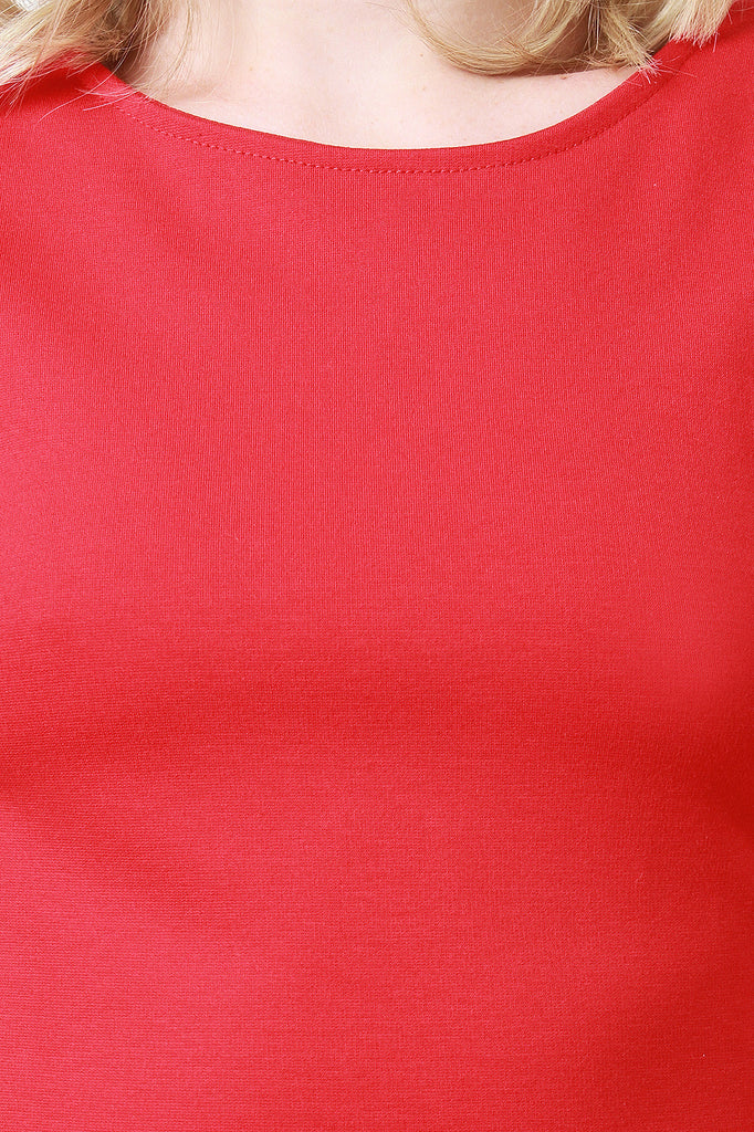 This chic dress features a round neckline, v-back to a gold-tone zipper fastener, quarter-length sleeves, stretchy sculpture fit, and a vent slit at back hemline. Accessories sold separately. Made in U.S.A. 33% Nylon, 62% Viscose, 5% Spandex.