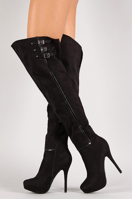 Featuring faux suede upper, three leatherette buckled straps embellishments at collar, slit and elastic gusset at back, leatherette trim at side, almond toe, platform, stiletto heel, stitching detail, fabric interior lining, lightly padded insole, and side zipper closure for easy on/off.