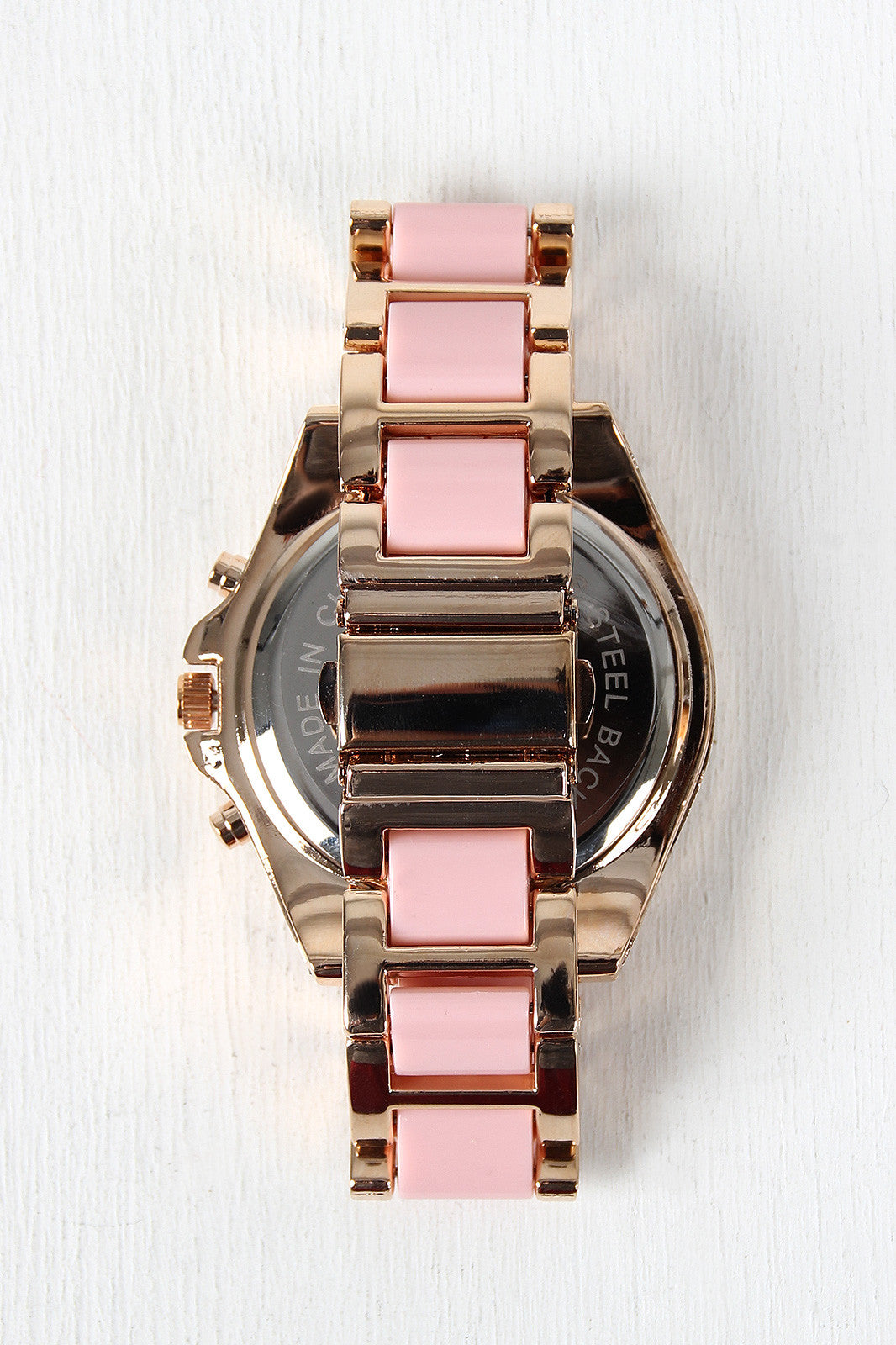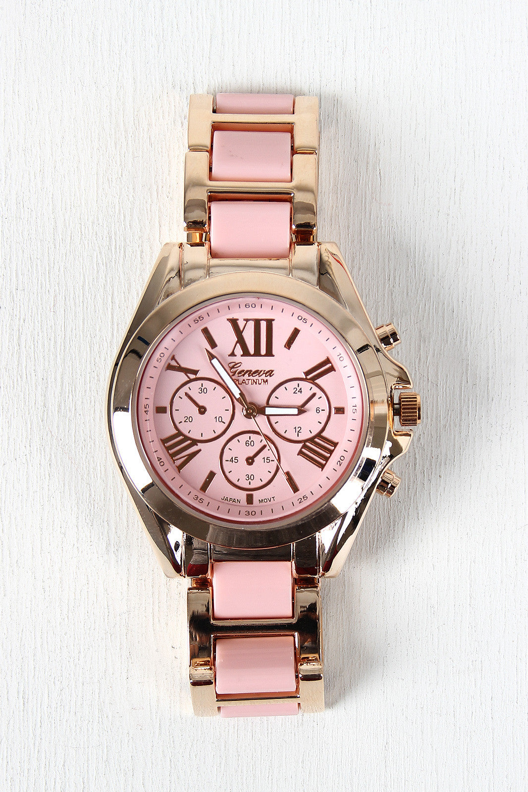 A colorful watch featuring a round face, dial markers, stainless steel back, and snap closure.