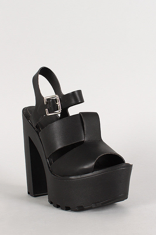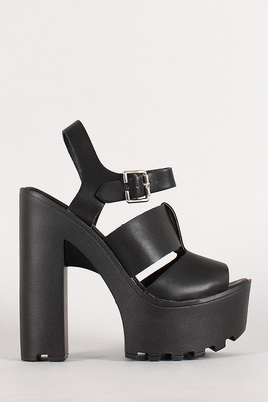 This statement-making lug sole platform heel features a peep toe, strappy leatherette design upper, and chunky platform heel. Finished with lightly padded insole and adjustable ankle strap with side buckle closure.