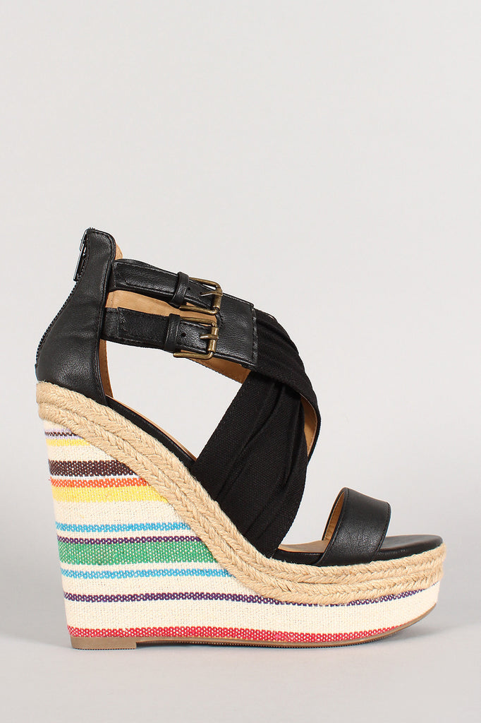 Featuring pleated design, criss cross construction on front vamp with side buckle accents, espadrille/tribal print platform and wedge heel. Finished with padded insole and rear zipper closure for easy on and off.