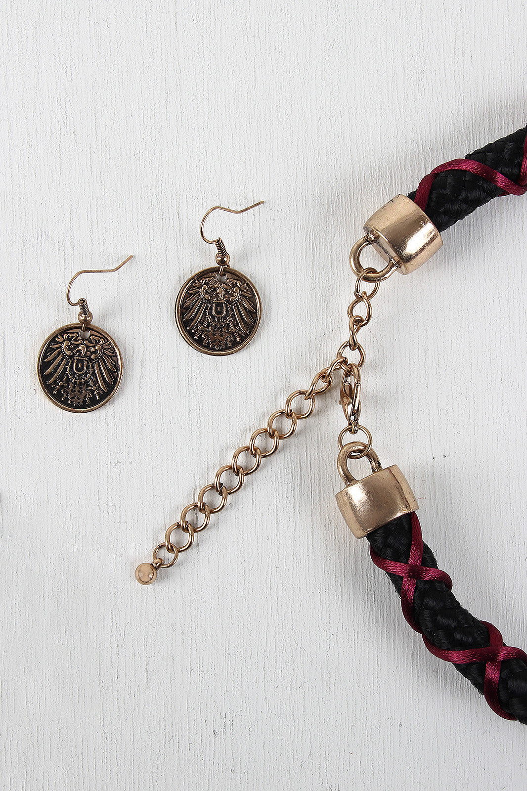 This necklace features strands of multicolor patterned rope tied together, a jeweled-encrusted centerpiece, and hanging iridescent beads and coin charms. Finished with an adjustable lobster hook closure and includes matching earrings.