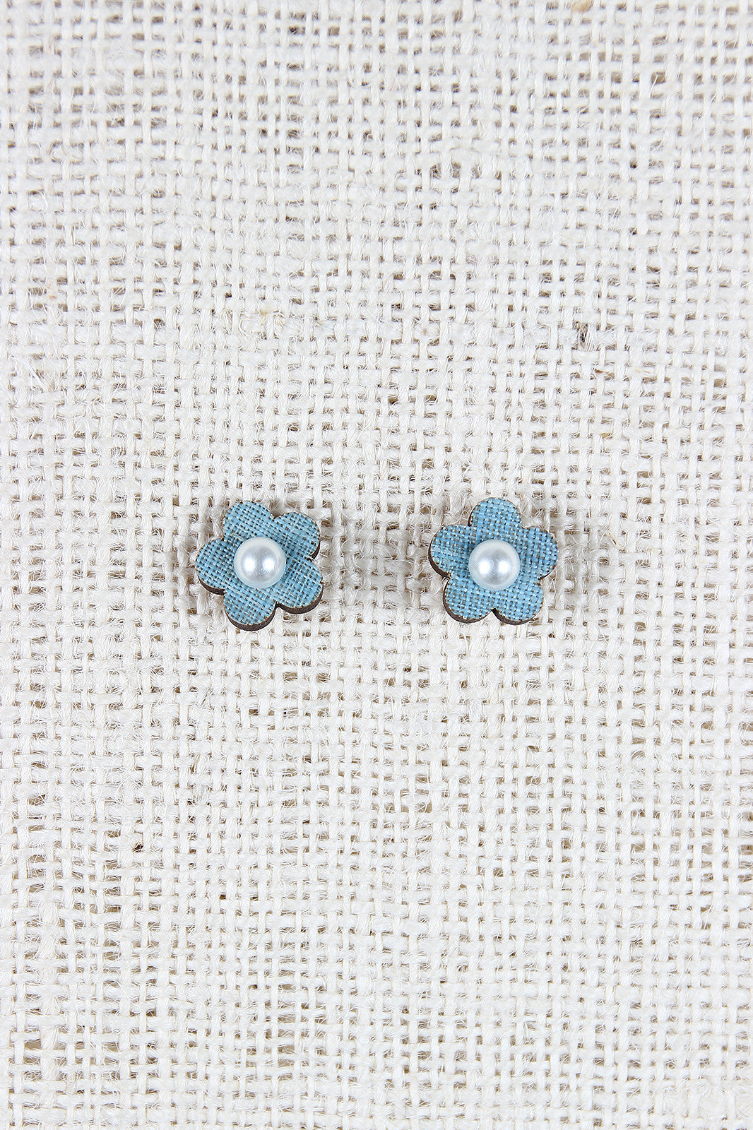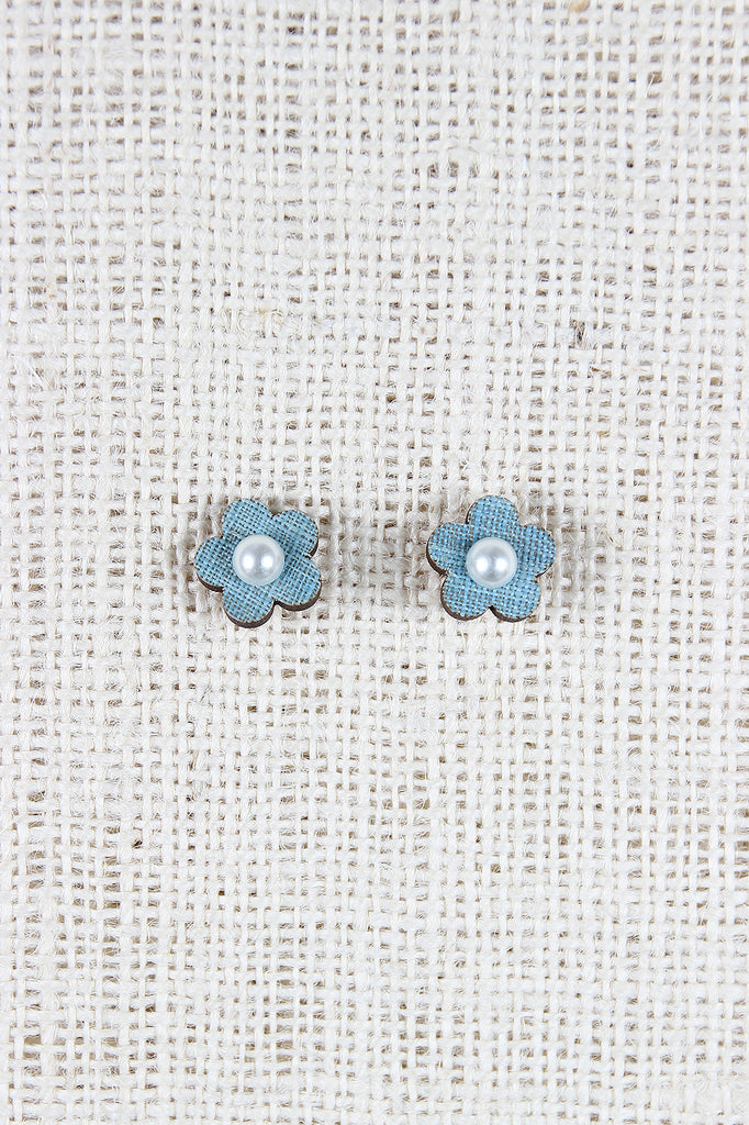 These flower-shaped wood earrings feature a linen-like texture, pearly center, and post backing.