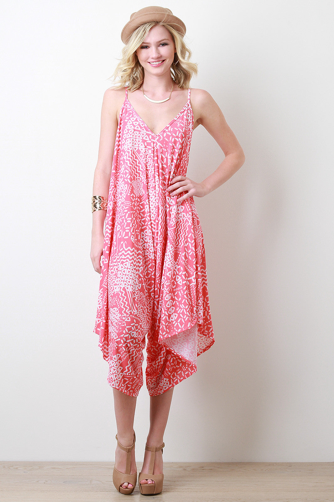 This jumpsuit features symbol pattern print design, sleeveless, v-neckline, and harem cut bottom half. Accessories sold separately. Made in U.S.A. 100% Polyester.
