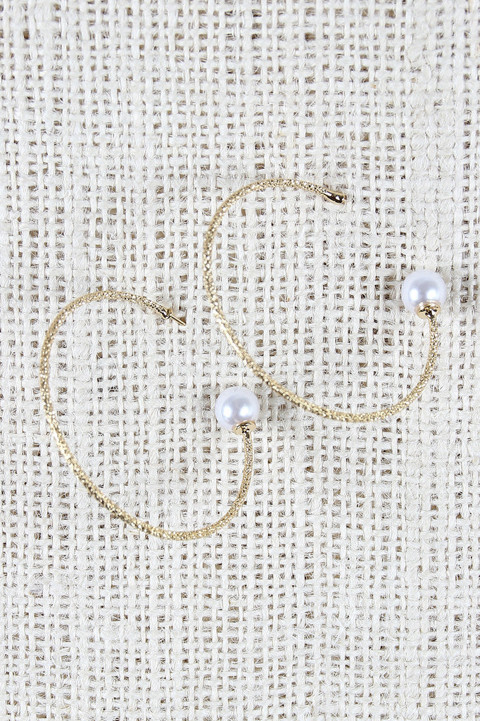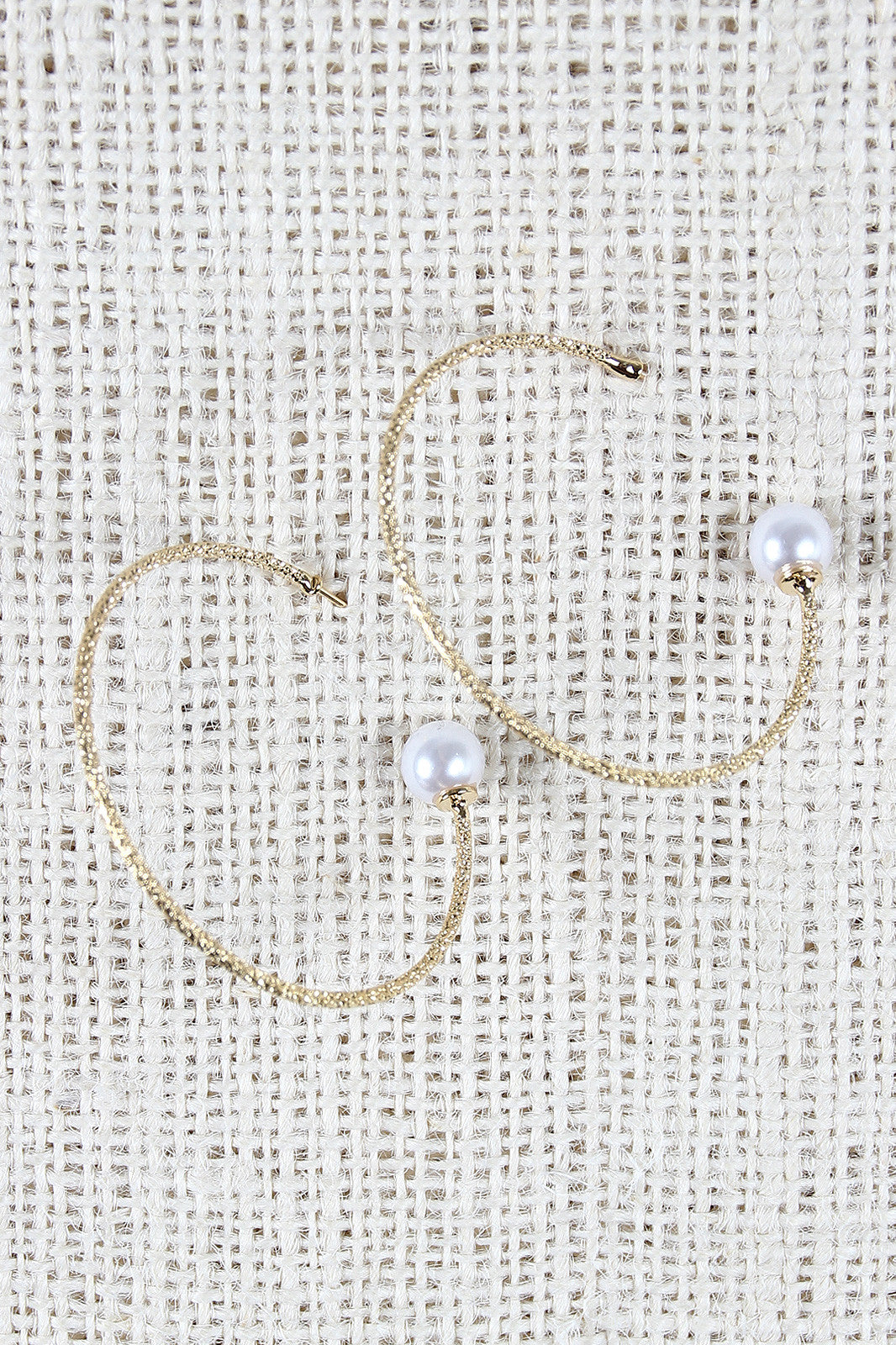 These open hoop earrings feature a glittery textured main with faux pearl ends. Finished with post backing.