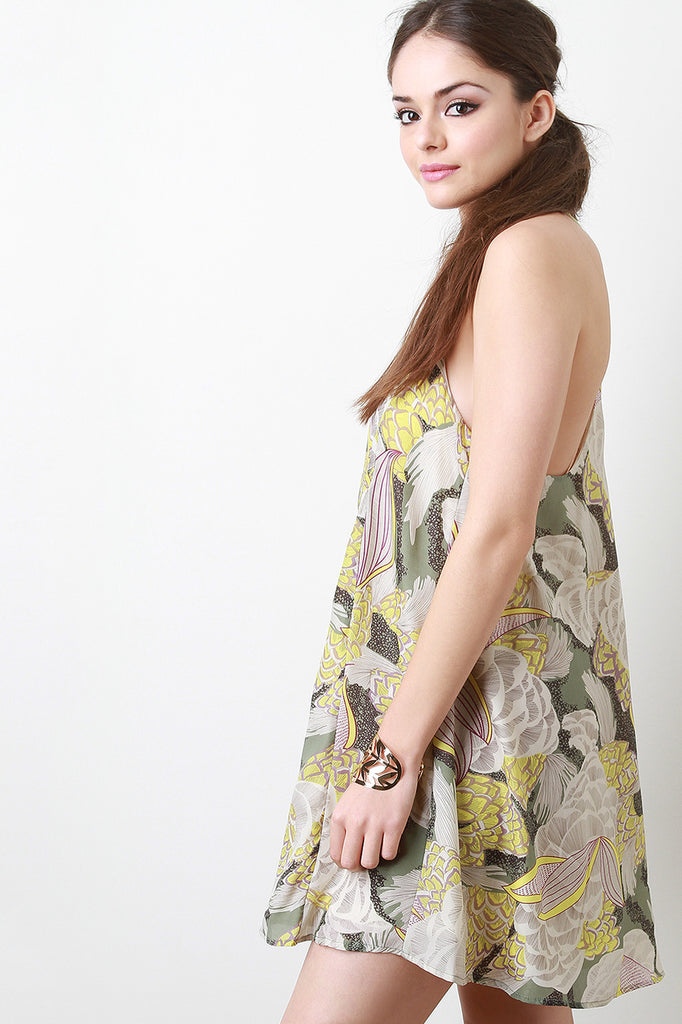 This dress features tropical print, v-neckline, double spaghetti straps, racer back, relaxed fit, and finished with lining. Accessories sold separately. Self: 100% Polyester. Contrast: 100%  Polyester.
