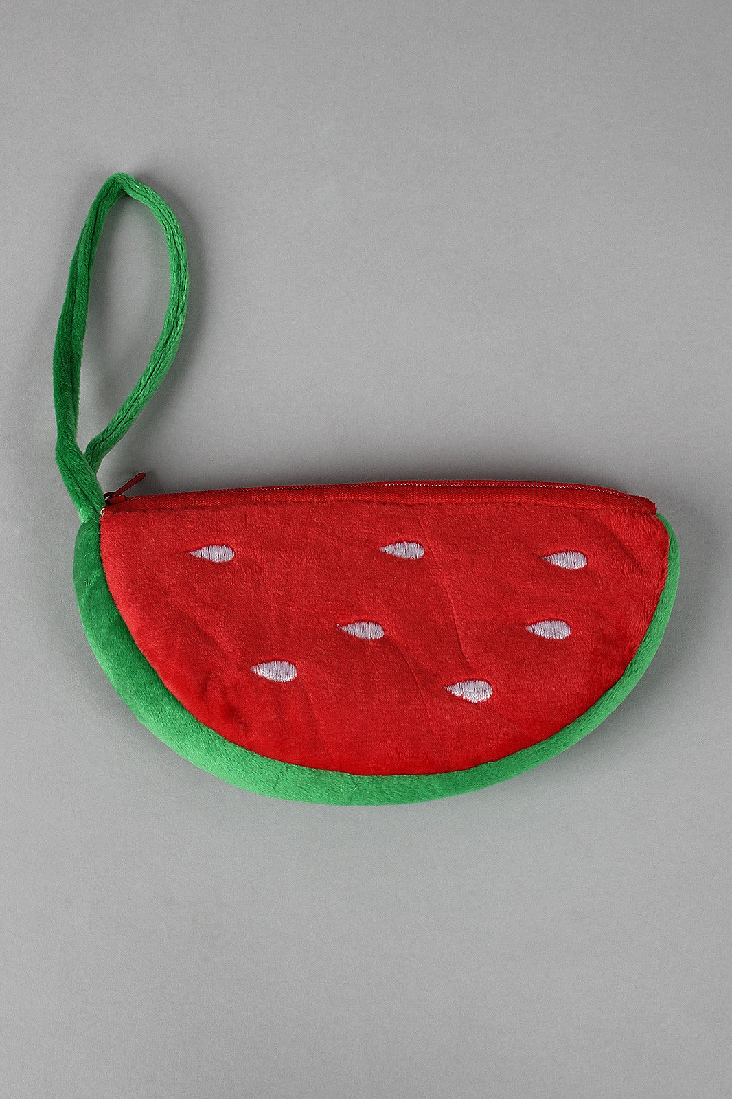 A fuzzy zippered pouch with embroidered strawberry design and clutch strap.