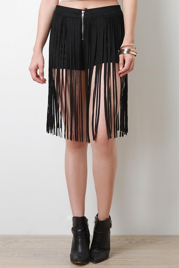 These shorts features a faux suede fabrication, long cascading fringe overlay, shorts underlay, and zipper fastener. Accessories sold separately. 100% Polyester.