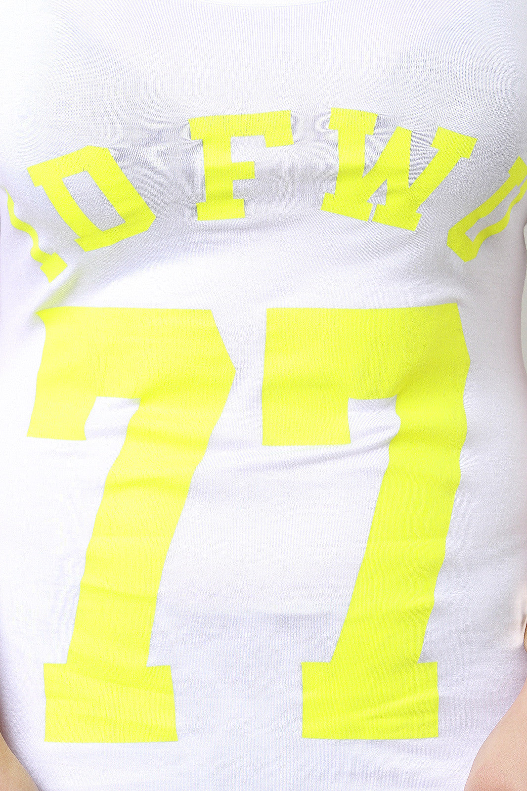 This soft knit bodycon dress is scoop neckline and short sleeve construction. Features writing print, IDFWU 77, on the front. Accessories sold separately. 97% Rayon. 3% Spandex.