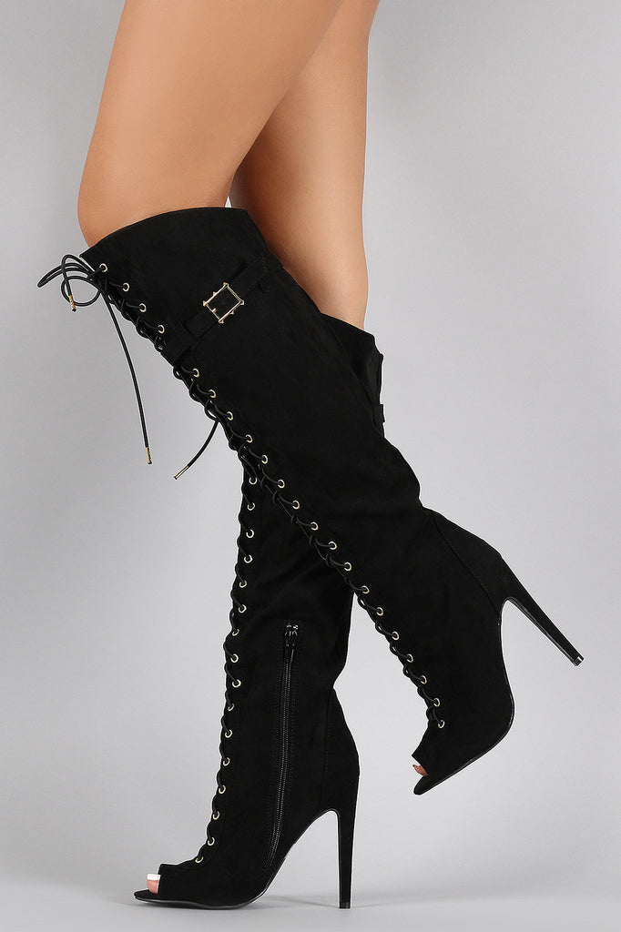 Qupid Faux Suede Lace Up Peep Toe Stiletto Thigh High Boot