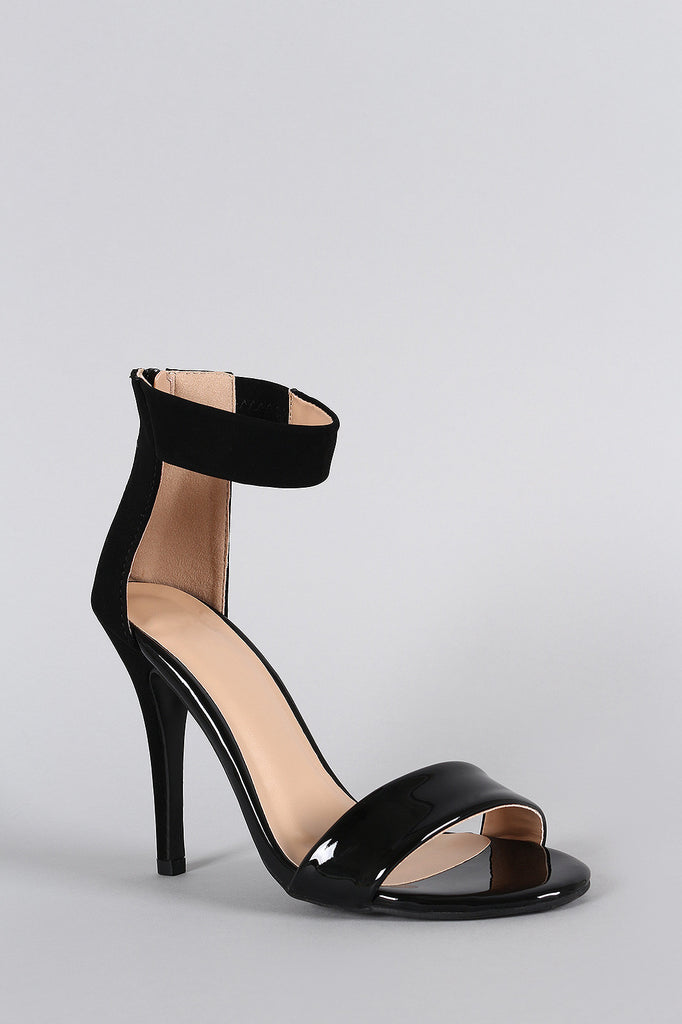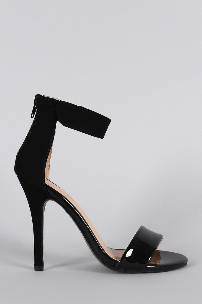 This open toe heel has an elegant polish to it, featuring a combination of patent and nubuck material. It is open toe structure with an ankle strap, partially elasticized. Finished with a rear back adjustable zipper closure.