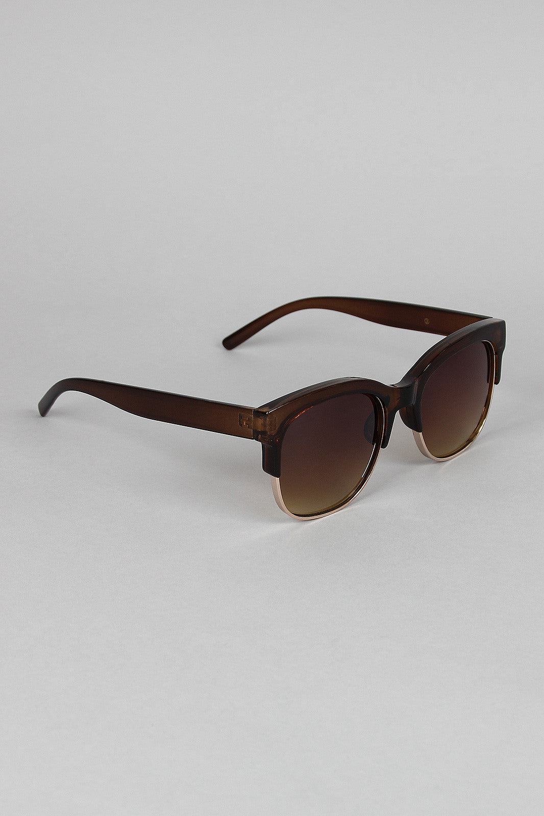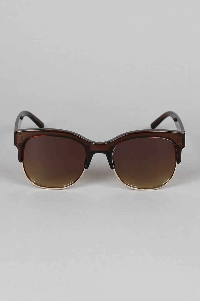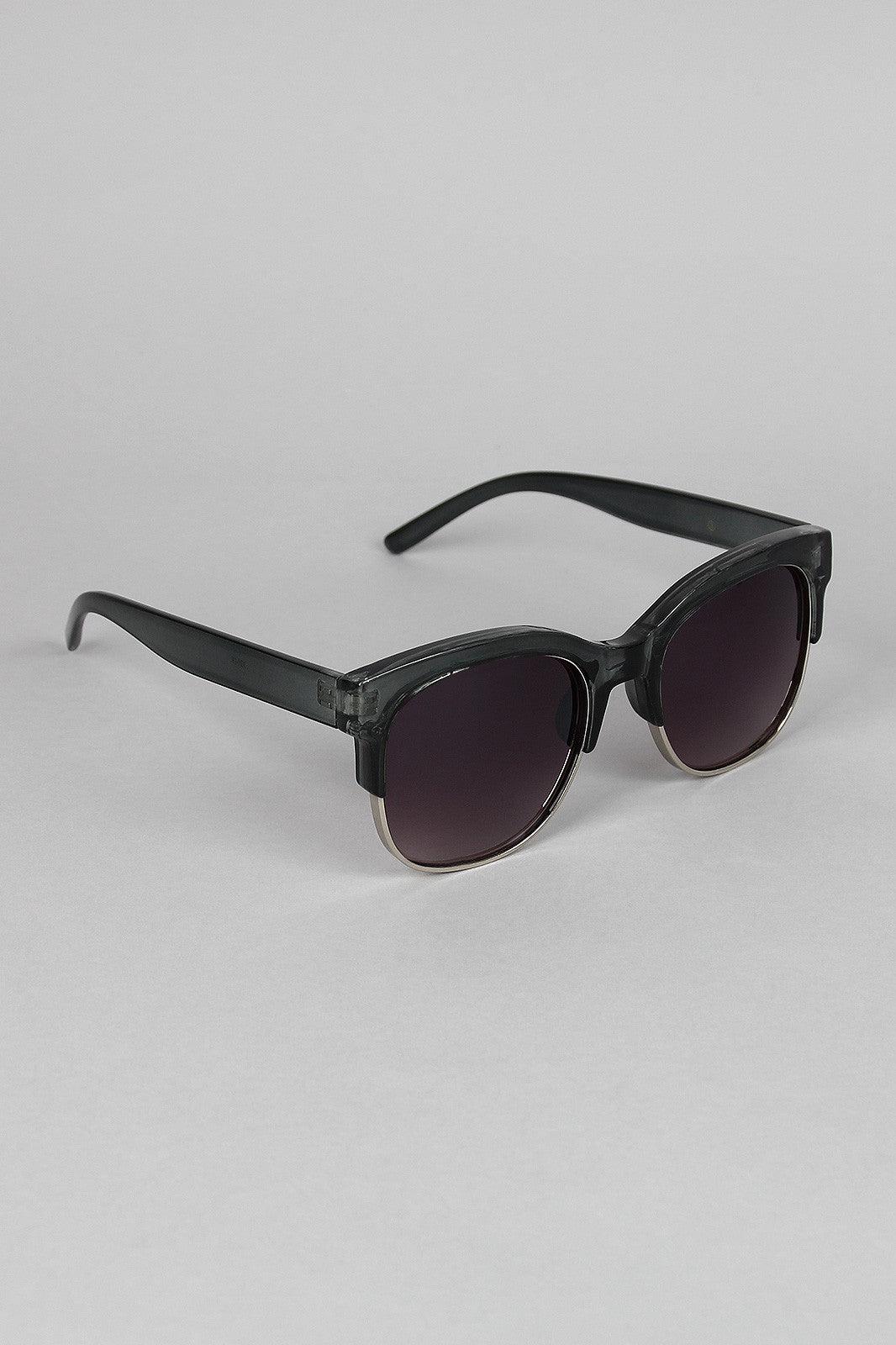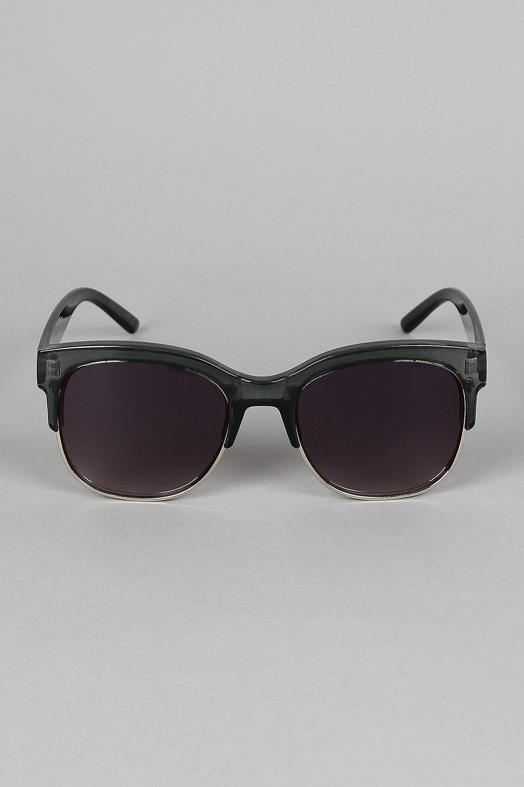 Clubmaster style sunglasses with boxy plastic brow, thick metallic bottom frame, and slightly gradient lenses.