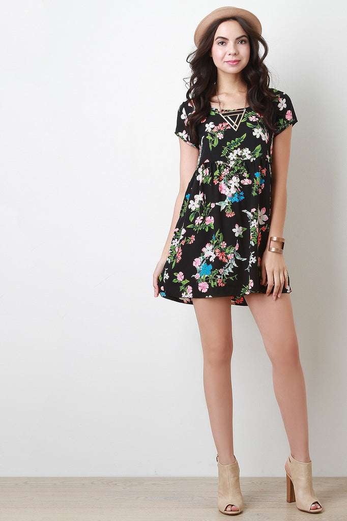This floral print dress features round neckline, short sleeves, empire waist, and finished with a-line cut. Accessories sold separately. 100% Polyester.