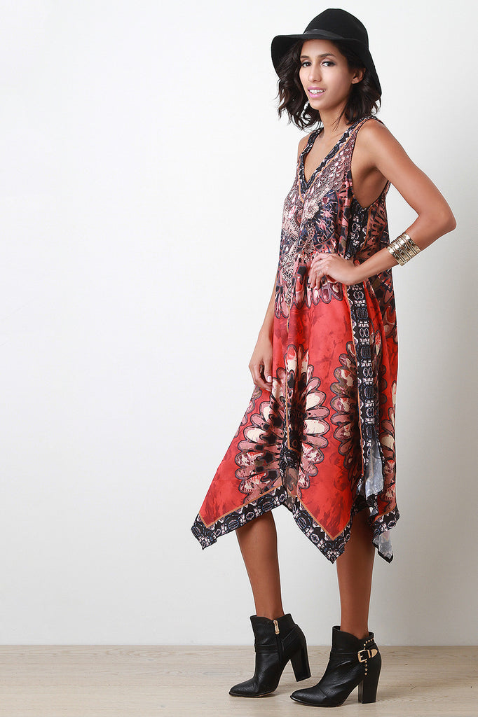 This midi dress features mixed print, deep v-neckline, sleeveless construction, open back, and finished with handkerchief hemline. Accessories sold separately. 100% Polyester.