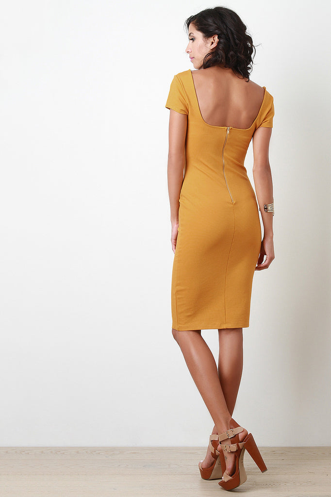 This simple, yet elegant, midi dress is curve hugging with a sweetheart neckline. It is short sleeve design and features an adjustable back zipper. Accessories sold separately. 33% Nylon. 62% Viscose. 5% Spandex.