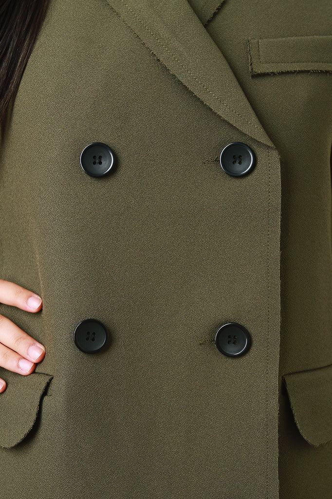 This heavyweight dress features a notched collar, double breasted front design, and raw hems. Finished with one faux breast pocket and two flap pockets at sides. Accessories sold separately. 100% Polyester.
