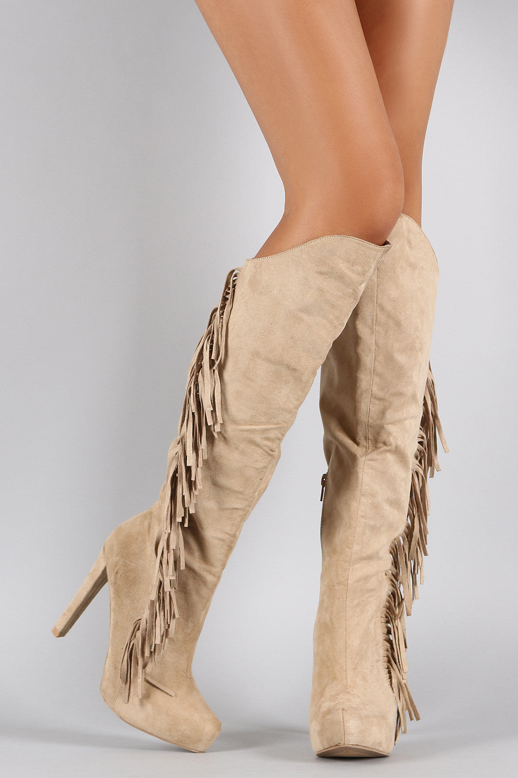 Qupid Suede Asymmetrical Fringe Pointy Toe Heeled Knee High Boot