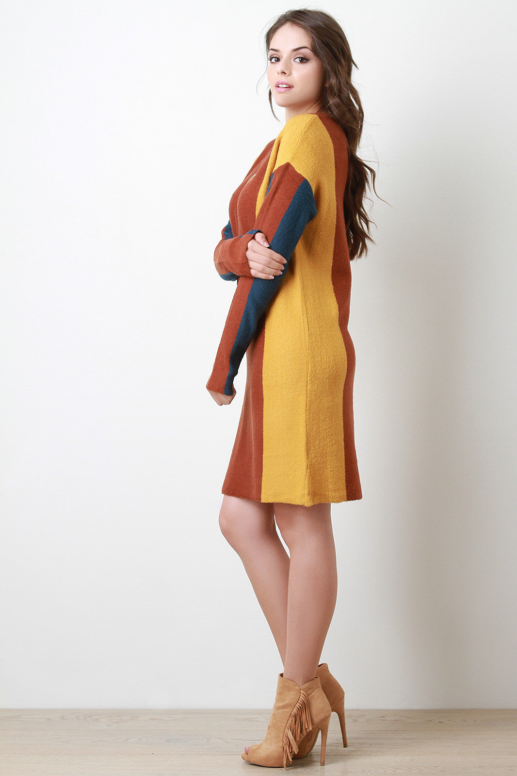 This soft knit sweater dress features vertical color block design, round neckline long sleeves, and a casual shift cut fit. Accessories sold separately. 50% Acrylic, 40% Nylon, 10% Polyester.