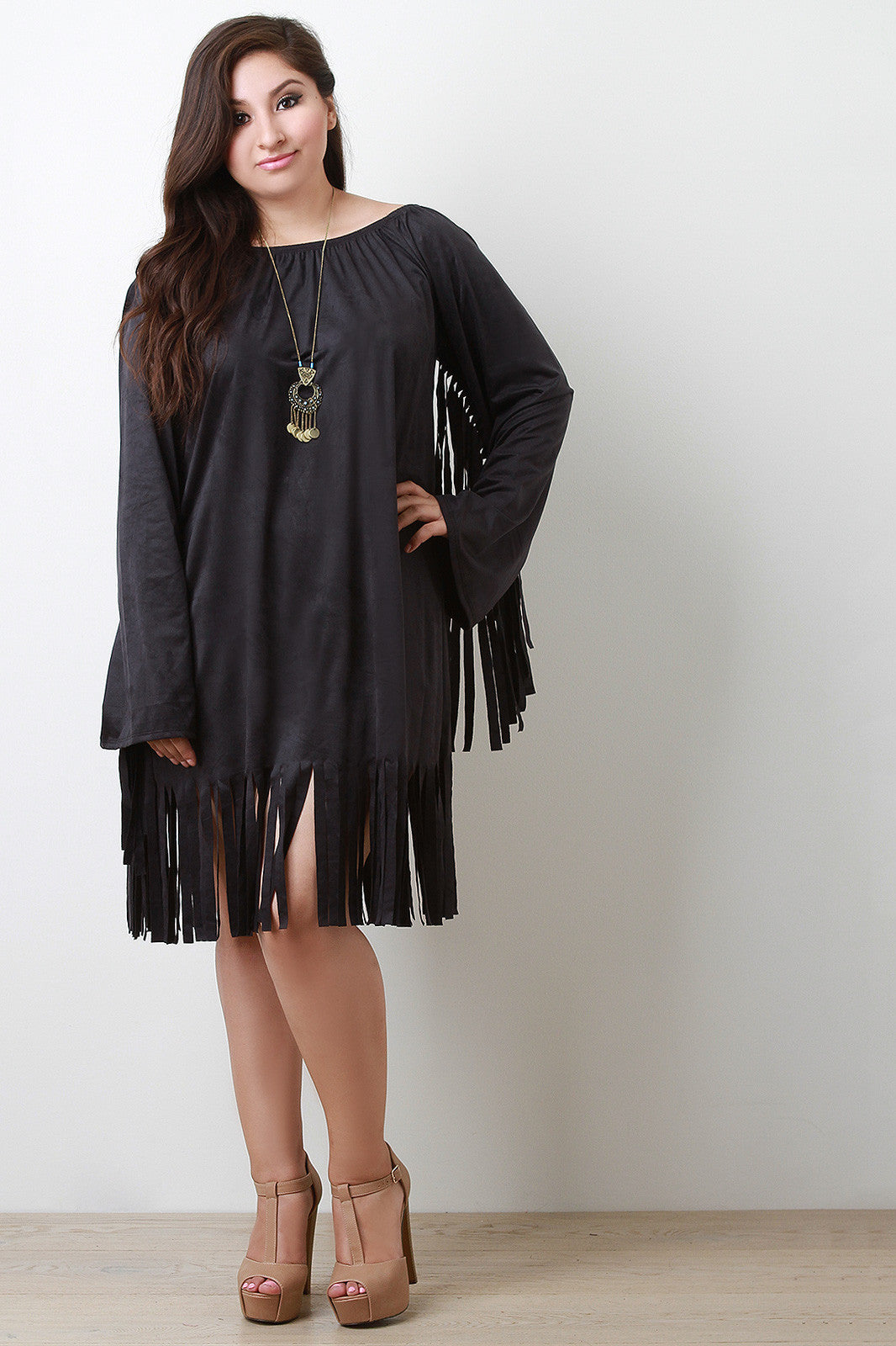 Bohemian Suede Long Sleeve Fringe Accents Mini Dress