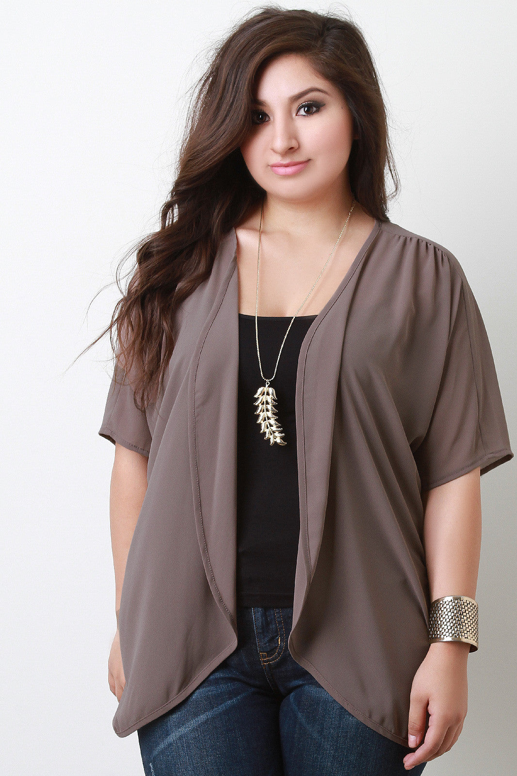 This plus size sheer cardigan has a shawl draping kimono style bodice with an open front. Accessories sold separately. 100% Polyester.