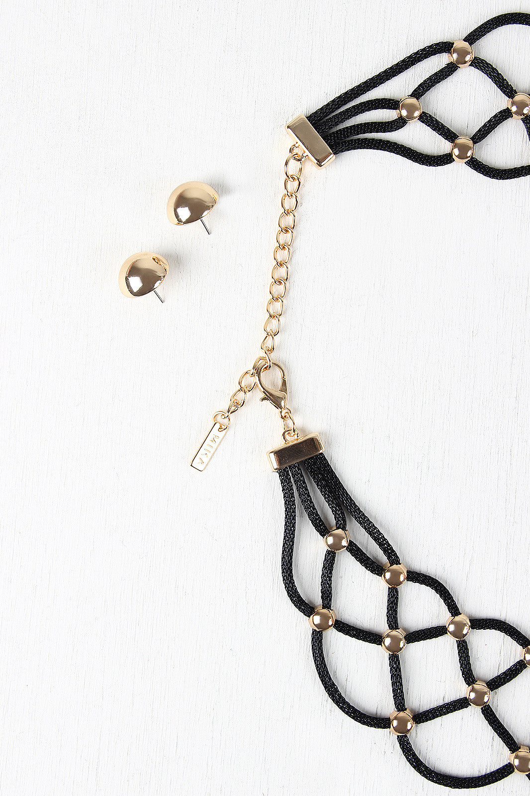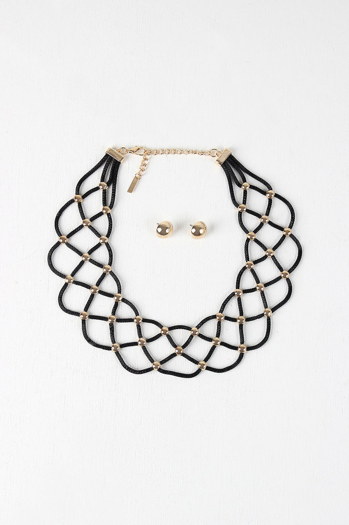 This statement necklace features strands of mesh tube chain sectioned into a lattice pattern and pinned in place with glossy round studs. Necklace is finished with adjustable lobster hook closure and matching earrings. Lead and nickel compliant.