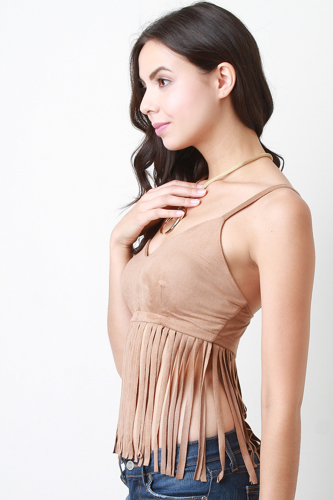This sleeveless top features microfiber vegan suede fabrication, v-neckline, soft cup padding, and long fringe construction. Accessories sold separately. Made in U.S.A. 92% Polyester, 8% Spandex.
