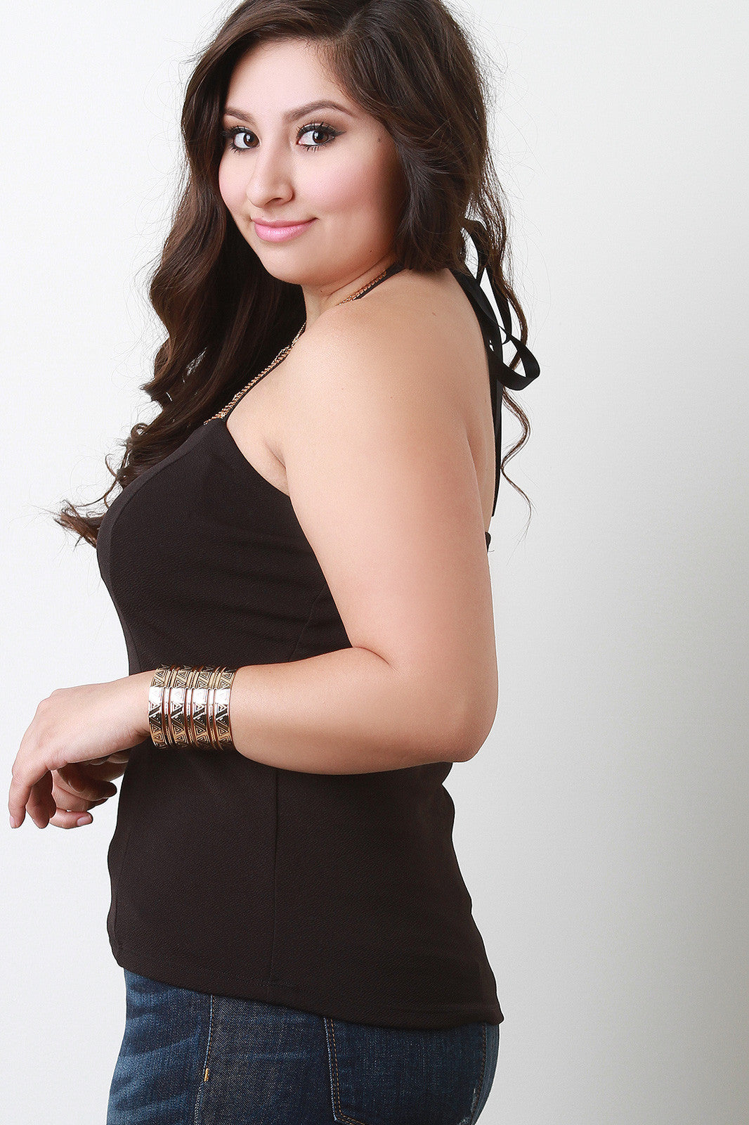 This chic plus size  top features a caged yoke with gold-tone chain accent, self-tie halter neckline, sweetheart neckline with padded cups, princess seam front, texture knit fabrication, and partially lined. Accessories sold separately. Made in U.S.A. 95% Polyester, 5% Spandex.