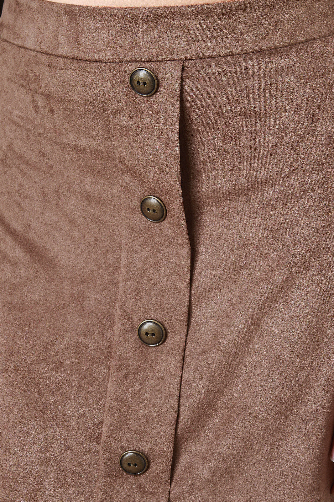 This faux mini skirt features a decorative button-up front and back zipper closure. Accessories sold separately. Made in U.S.A. 95% Polyester, 5% Spandex.