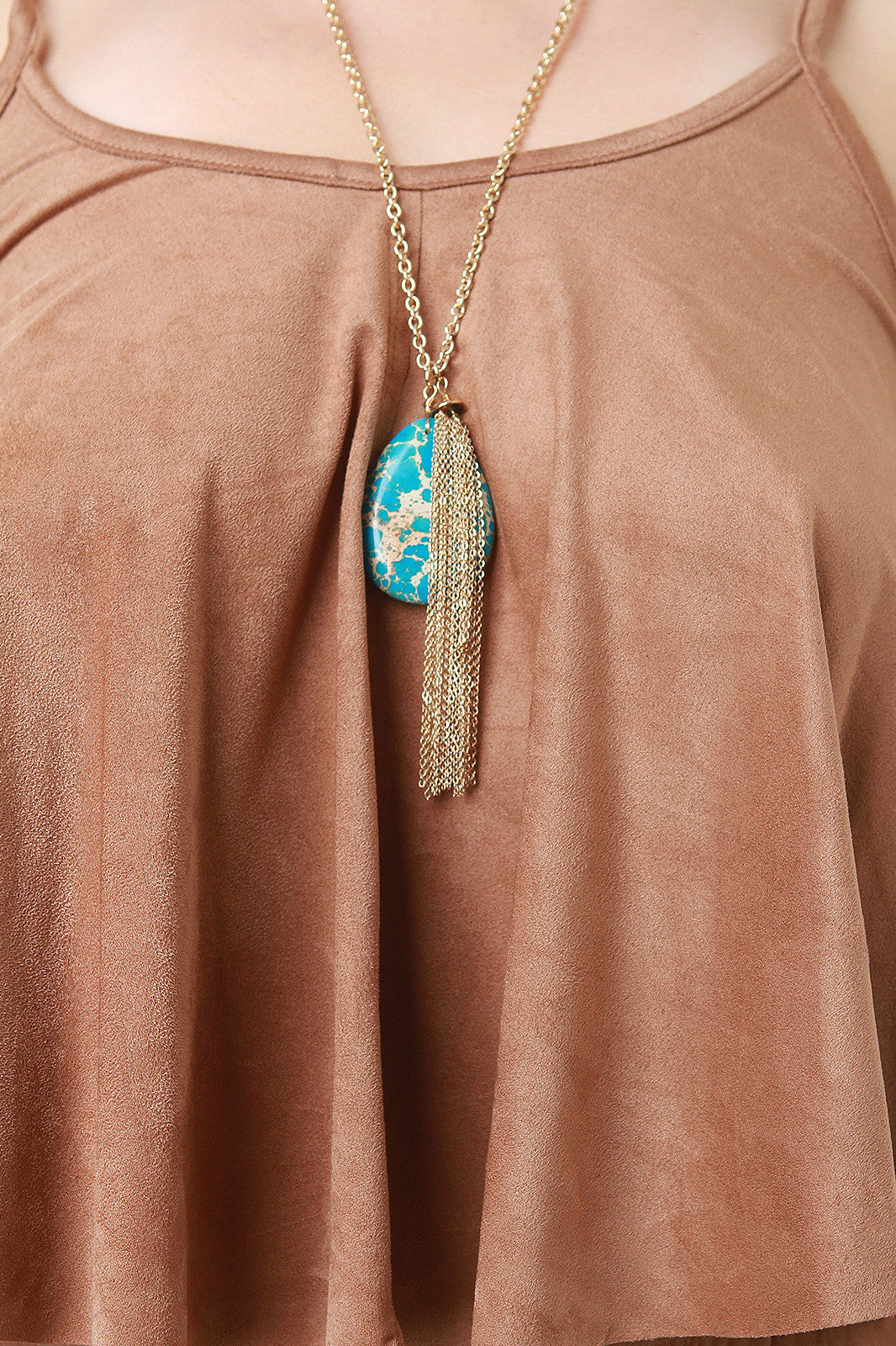 A flowy suede , thin shoulder straps, and an unfinished hem. Accessories sold separately. Made in U.S.A. 90% Rayon, 10% Spandex.
