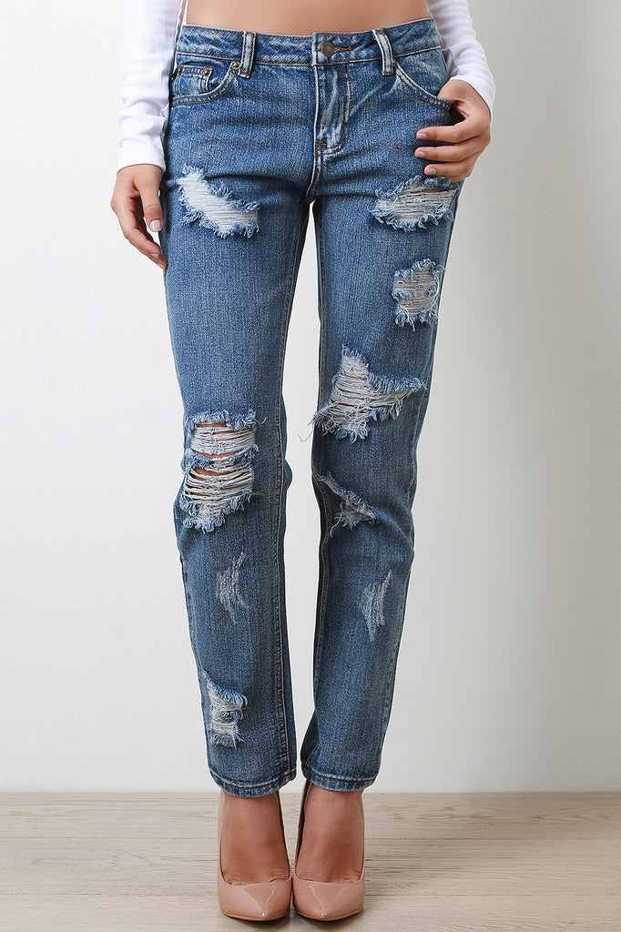 These boyfriend jeans features a relax taper cut fit, distress holes at front, low rise construction, belt loops, classic 5-pocket design, zipper fly and a single button closure. Accessories sold separately. Made in U.S.A. 100% Cotton.