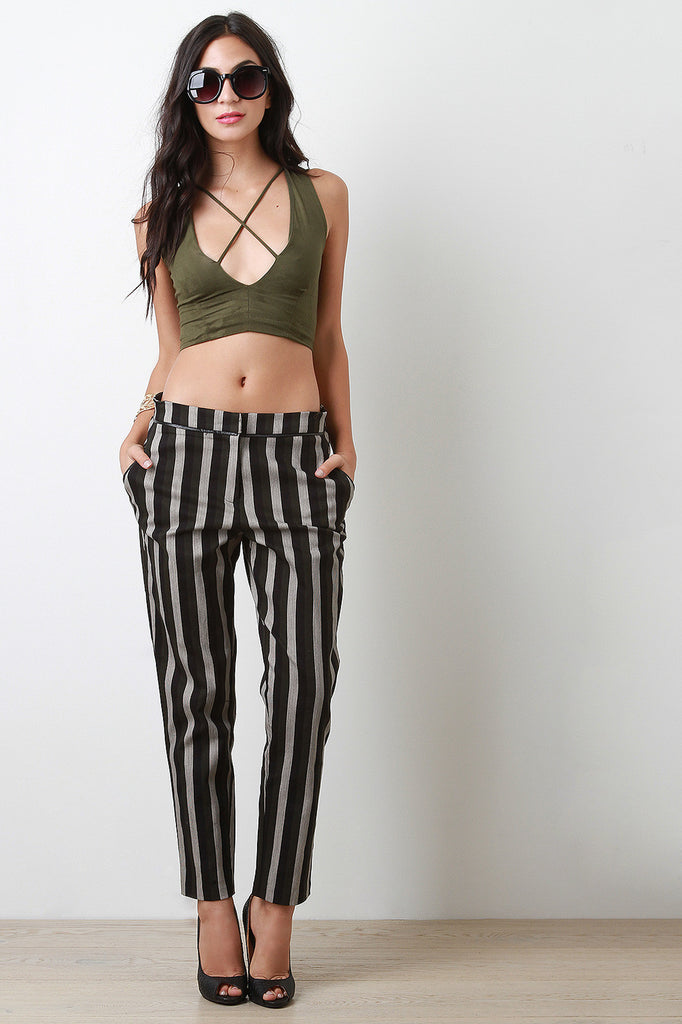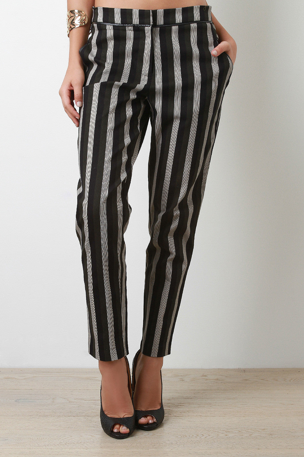 These pants features a low rise construction with zipper fly, hidden hook and button closure, side slit pockets, taper cut legs, tri-color vertical stripes and finished with vegan leather piping at waist and pocket opening. Accessories sold separately. 55% Rayon, 45% Cotton. Lining 100% Polyester.