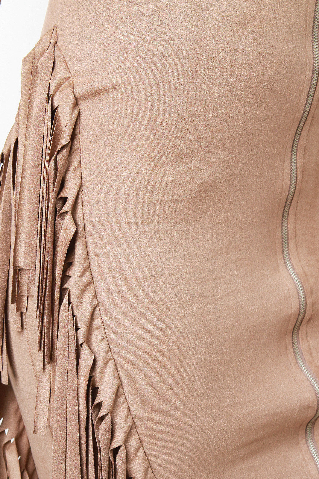 This microfiber vegan suede dress features a v-neckline with a zipper front, sleeveless, spaghetti shoulder straps, stretchy silhouette fit, and arrowhead fringes at sides. Accessories sold separately. Made in U.S.A. 95% Polyester, 5% Spandex.
