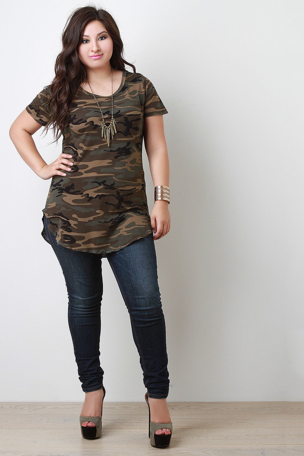 This tee is perfect for versatile wear. It is scooped neckline, short sleeves, and curved slight high-low hemline bodice. Designed with a camouflage pattern throughout. Accessories sold separately. 95% Cotton. 5% Spandex.