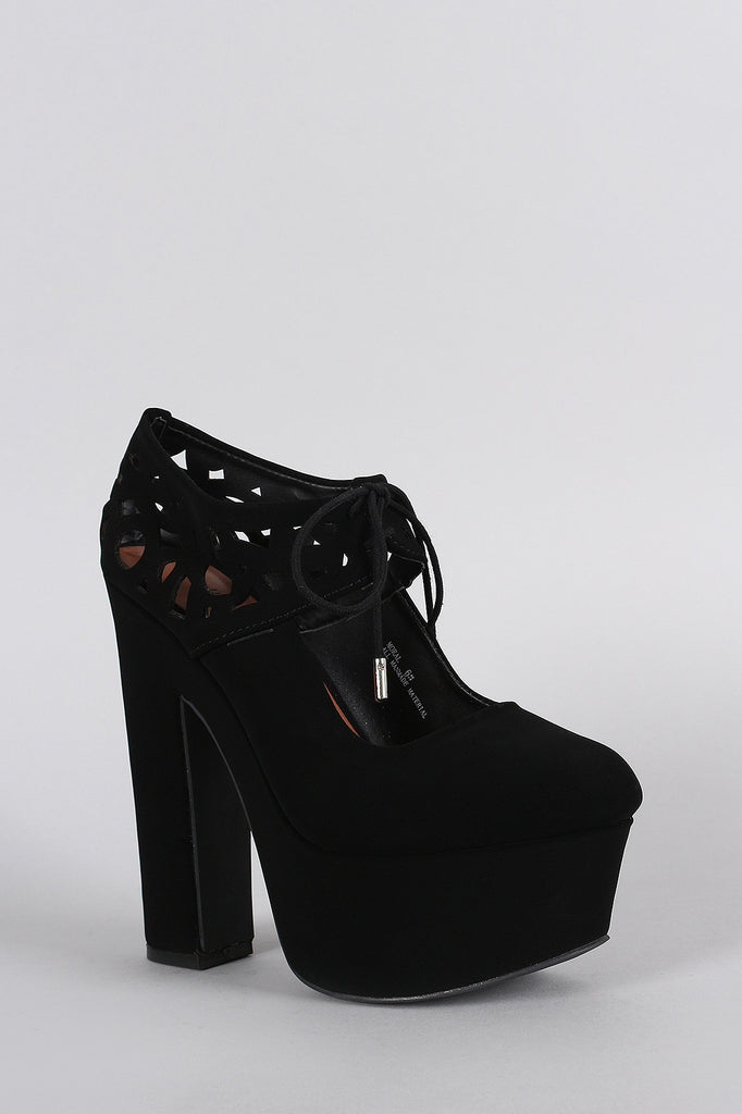 This modern Mary Jane platform and chunky heel. The Mary Jane straps feature geometric cutouts and self tie laces.