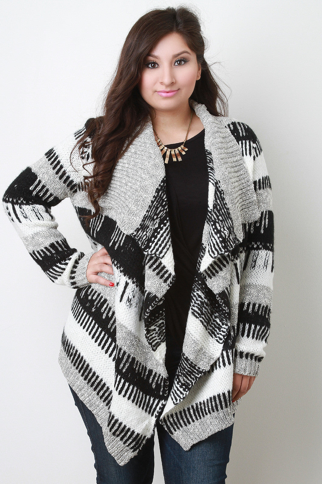 This plus size sweater features a thick mixed knit in a tribal stripe pattern throughout, long sleeves, and open front with splayed collar. Finished with ribbed collar, cuffs, and hem. Accessories sold separately. 100% Polyester.