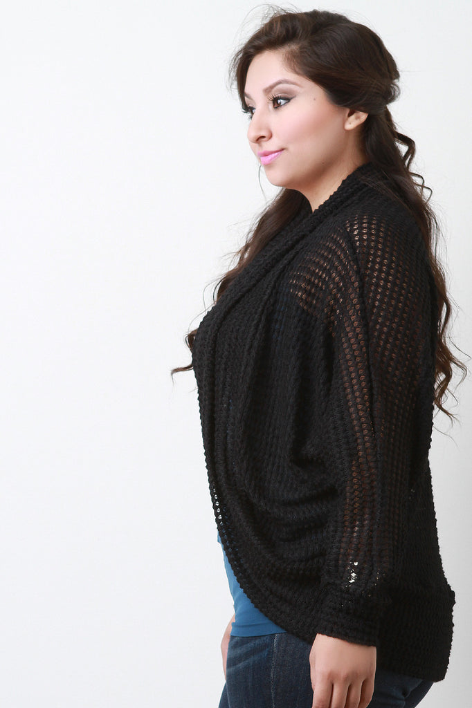 A plus size cardigan featuring loose popcorn knit, open front, and long dolman sleeves. Accessories sold separately. Made in U.S.A. 98% Polyester, 2% Spandex.