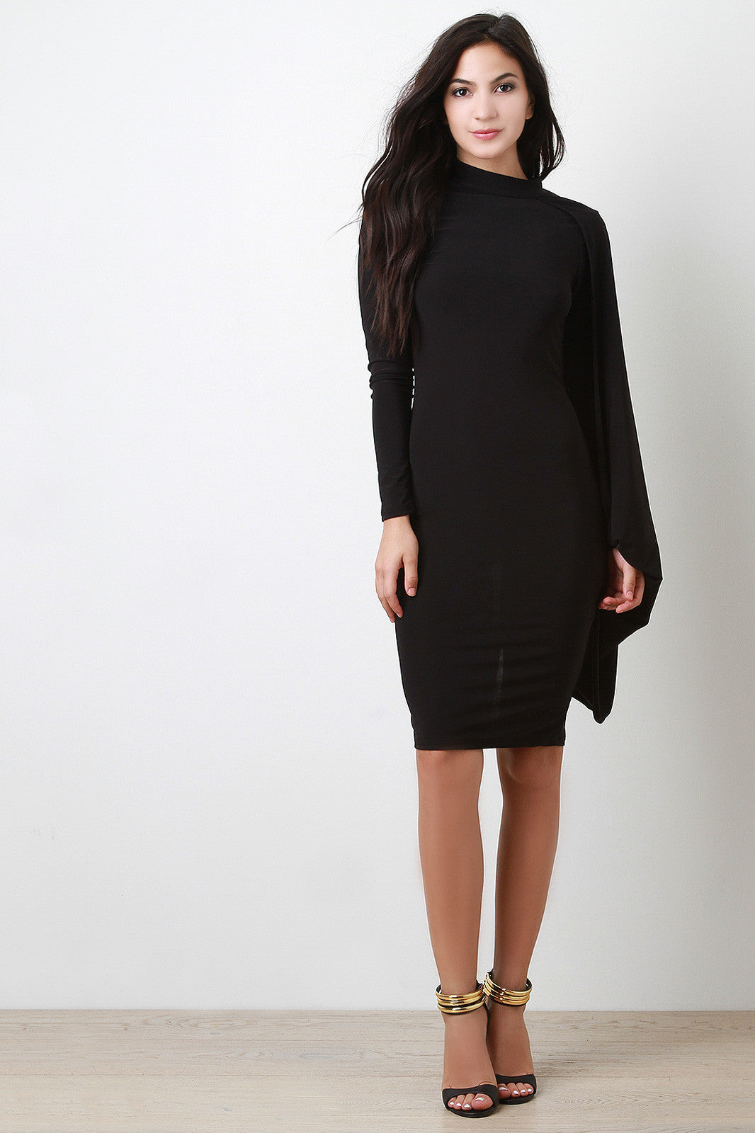 Open Back Mock Neck One Shoulder Cape Long Sleeves Midi Dress