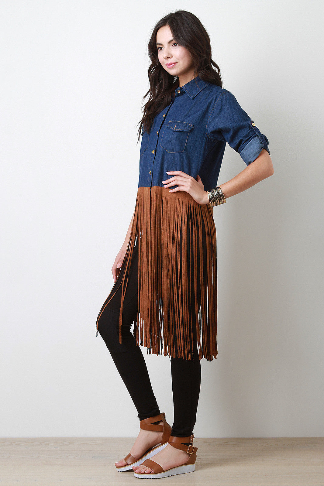 Contrast Suede Fringe Denim Long Sleeves Maxi Top