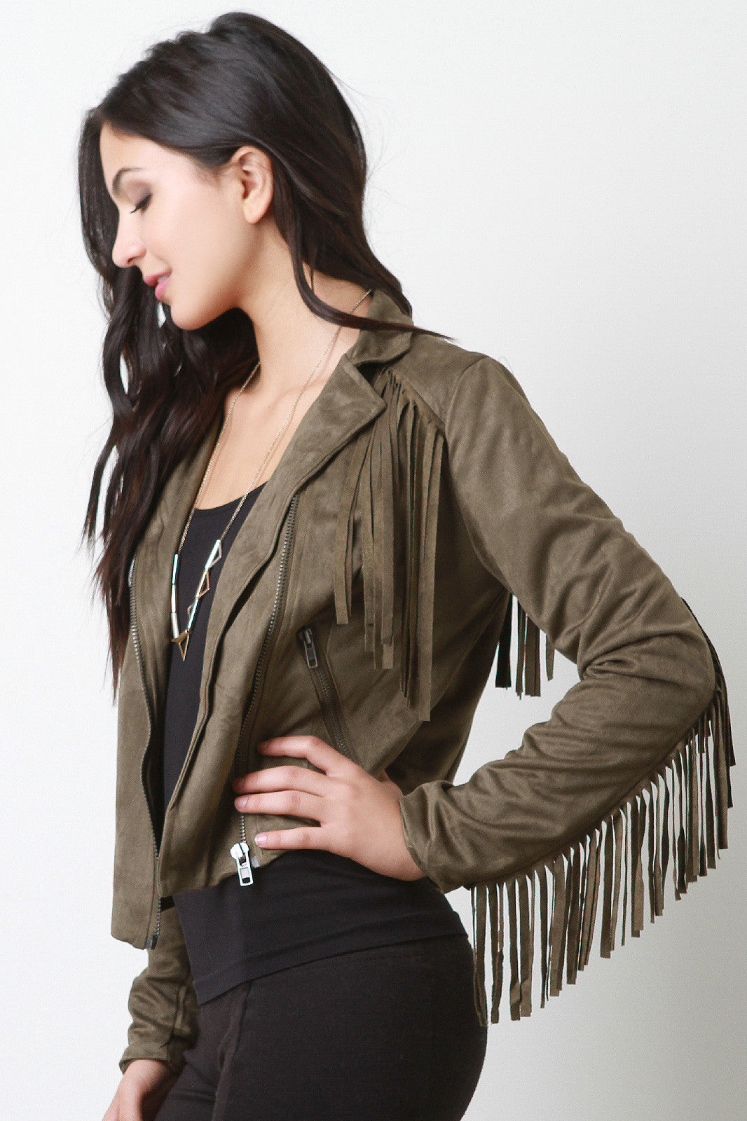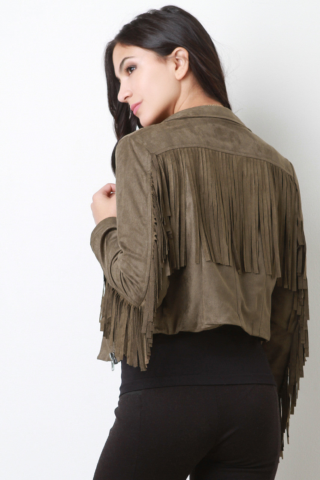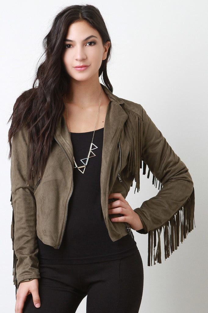 Zipped Up Suede Fringe Long Sleeves Jacket