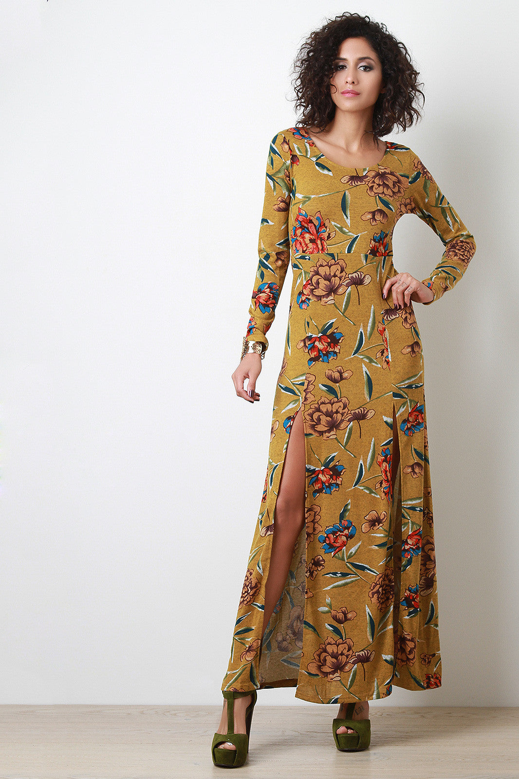 Floral Slit Maxi Sweater Long Sleeved Dress