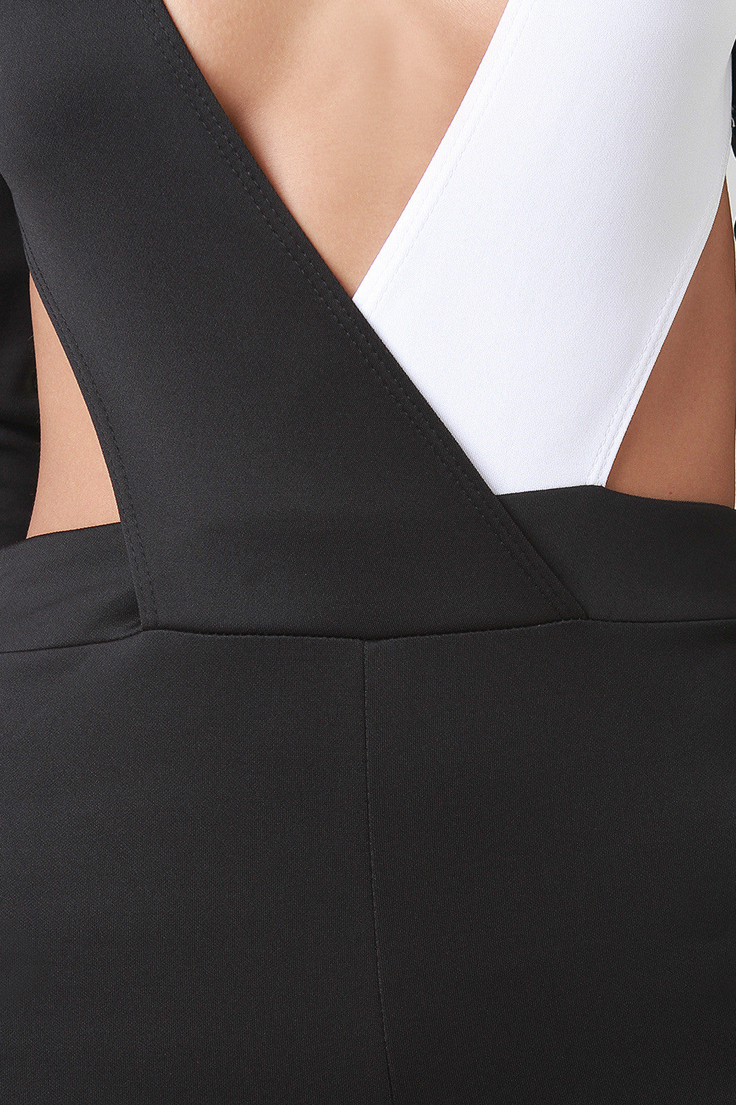 This jumpsuit features an overlapping front with a plunging v-neckline and contrast color side, cutout lower back, and three-quarter sleeves. Finished with fitted pants and back zipper closures. Accessories sold separately. Made in U.S.A. 96% Polyester, 4% Spandex.