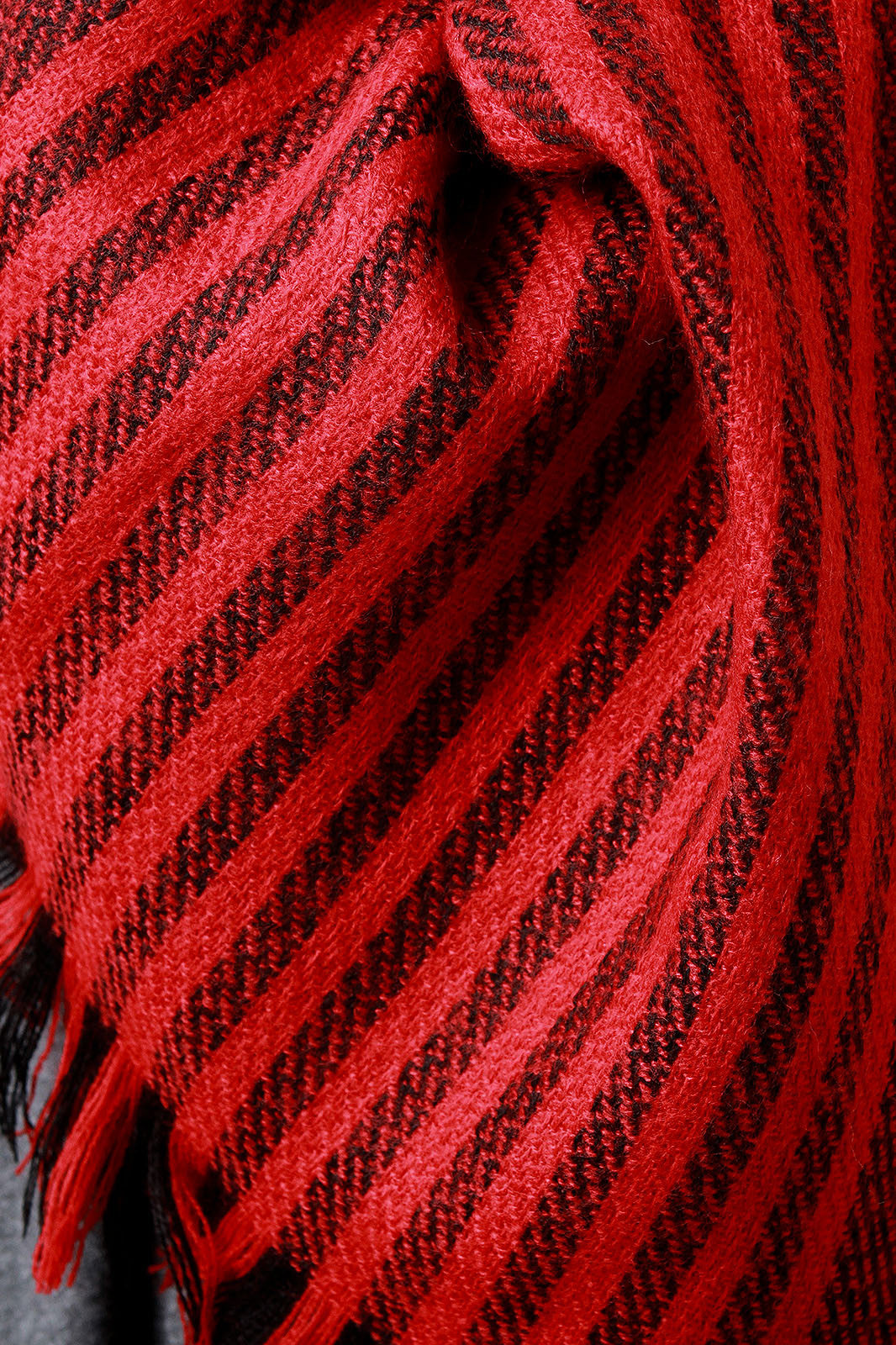 A large square scarf featuring striped melange knit and eyelash fringe edges.