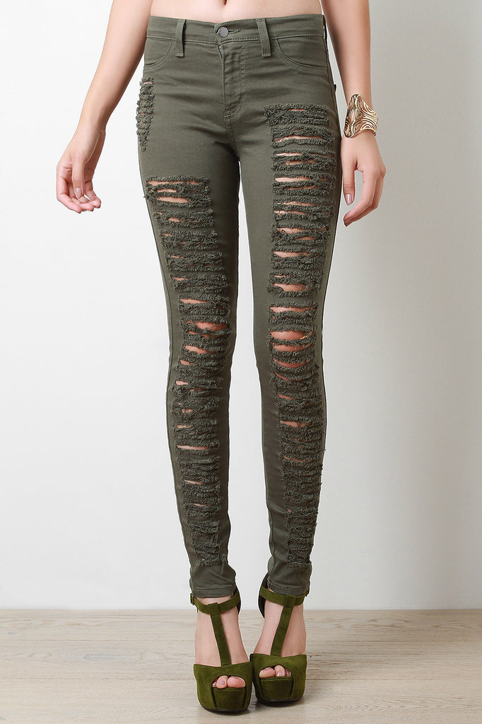 These skinny jeans features a high rise design, belt loops, zipper fly, single button closure, faux front pockets, working rear pockets, distress fringe slit along front, taper cut legs, and a stretchy sculpture fit. Accessories sold separately. Made in U.S.A. 98% Cotton, 2% Spandex.
