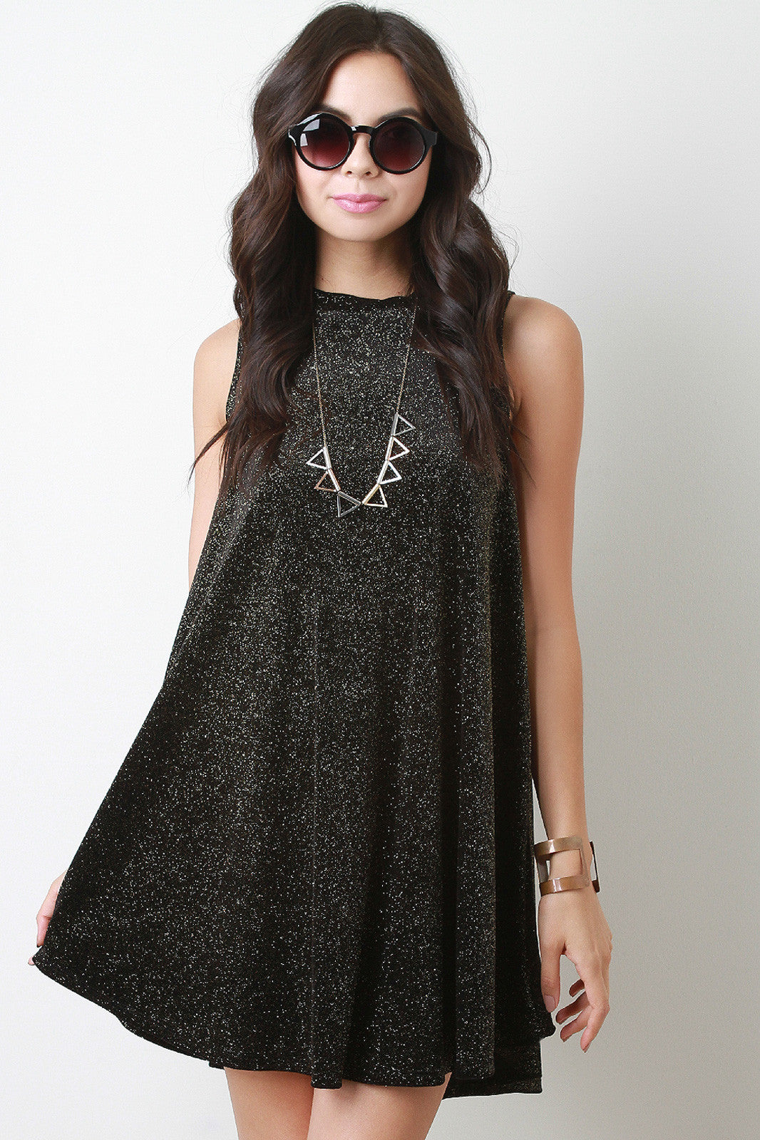 This flare cocktail dress features a mock neckline, all over shimmering glitter throughout, sleeveless design, and finished with high-low hemline. Accessories sold separately. Made in U.S.A. 90% Polyester, 10% Spandex.