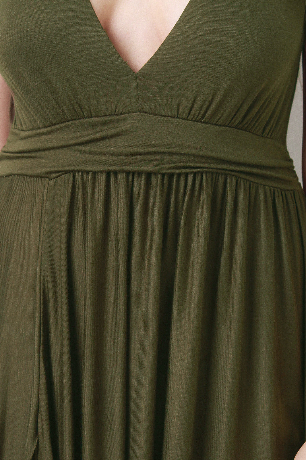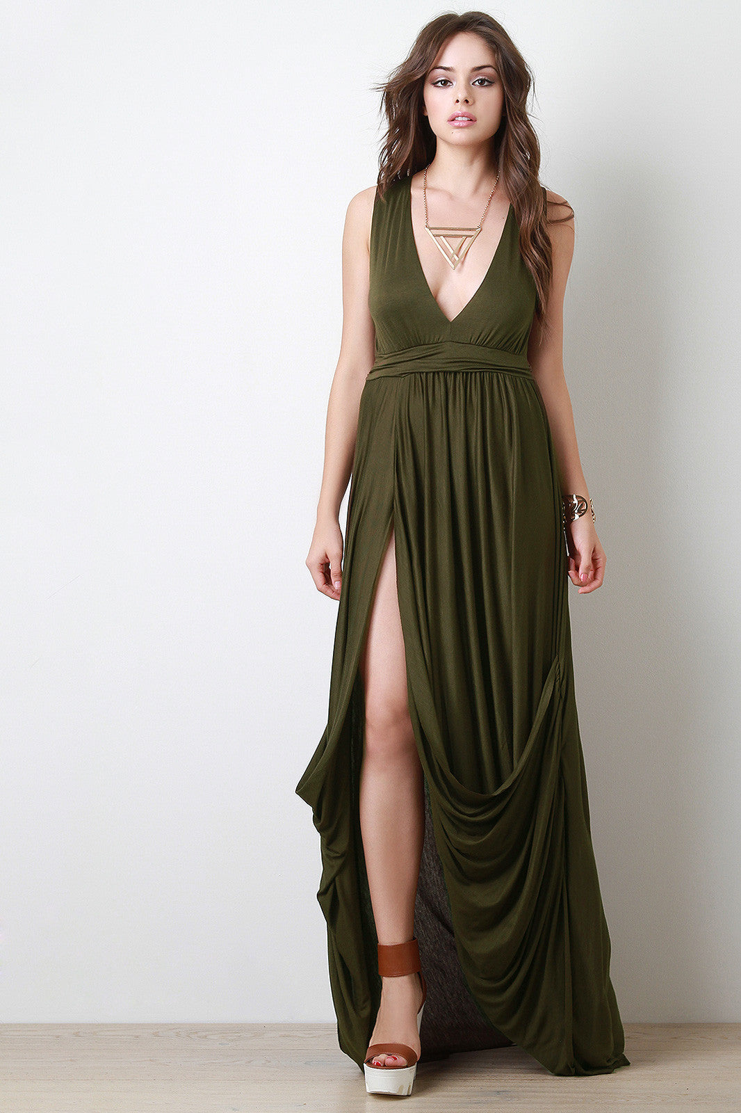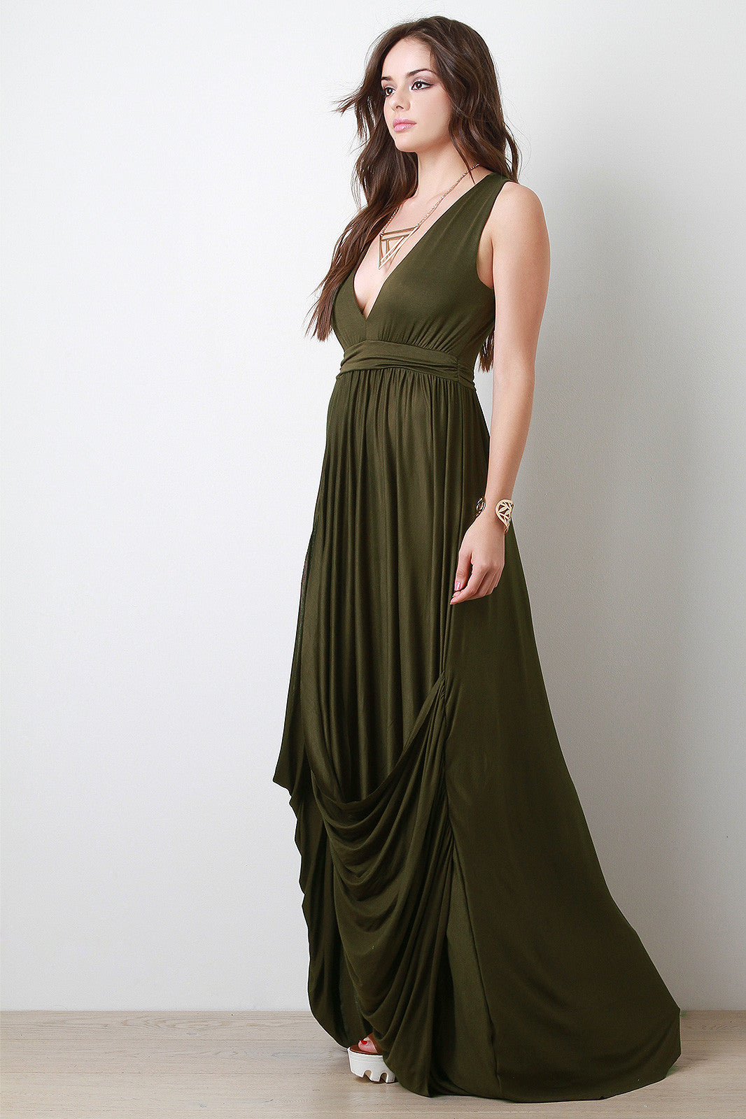 This jersey knit maxi dress features a floor swept design, sleeveless, plunging v-neckline, ruched cinched waist to a drape constructed skirt and a high vent slit finish. Accessories sold separately. Made in U.S.A. 96% Rayon, 4% Spandex.