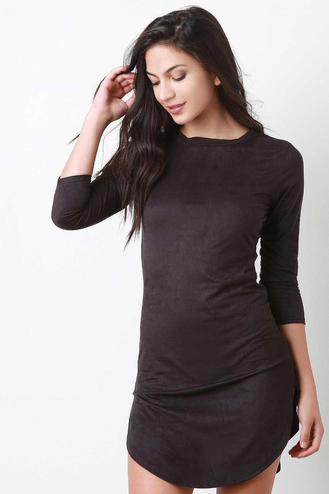 This microfiber vegan suede dress features a round crew neckline, quarter-length sleeves, rounded hemline, and stretchy fit. Accessories sold separately. Made in U.S.A. 93% Polyester, 7% Spandex.