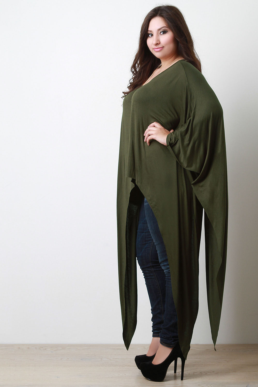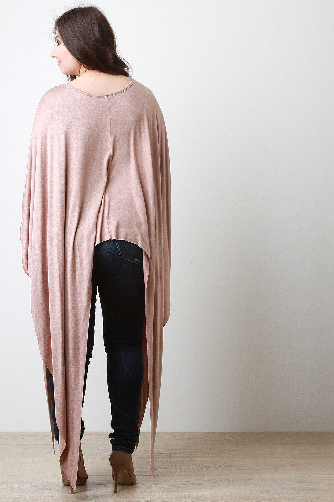 This plus size poncho top features solid color jersey knit, round neckline, and a sharkbite hemline. Unlined. Accessories sold separately. Made in U.S.A. 95% Rayon, 5% Spandex.