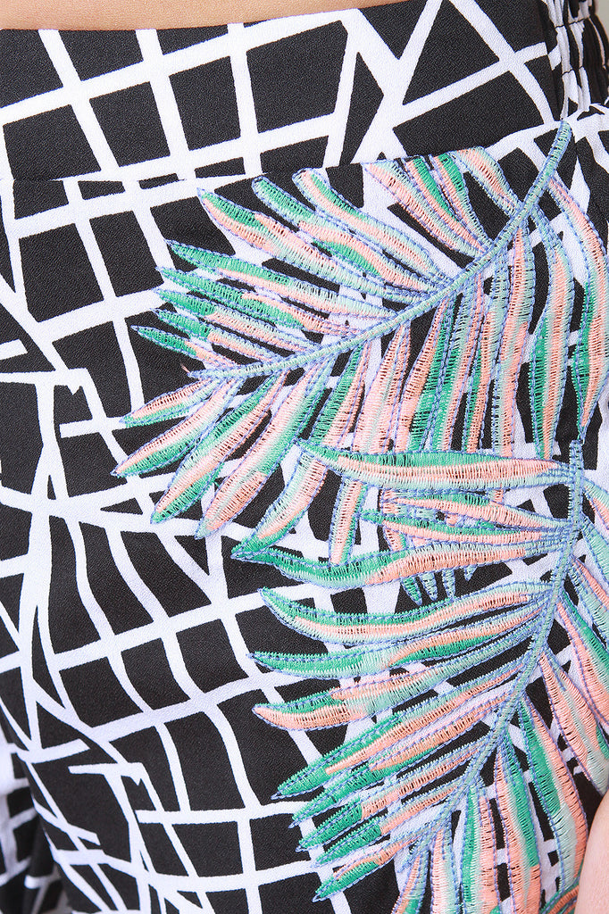 These trouser pants features contrasting graphic pattern, colorful embroidery palms at side, cinched panel waist with an elasticized back, and taper cut legs. Accessories sold separately. 100% Polyester.