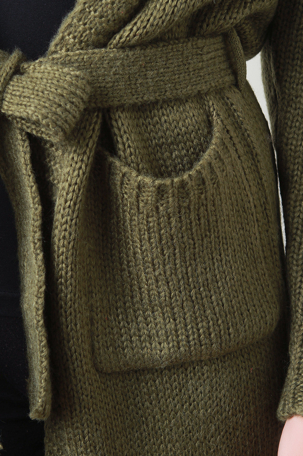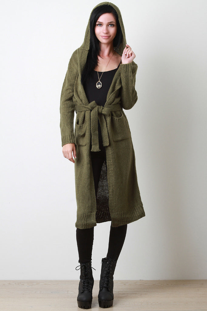 This stylish hooded cardigan features a ribbed knit fabrication, long sleeves, open front design with two pockets, and finished with self-tie belt at waist. Accessories sold separately. 100% Acrylic.
