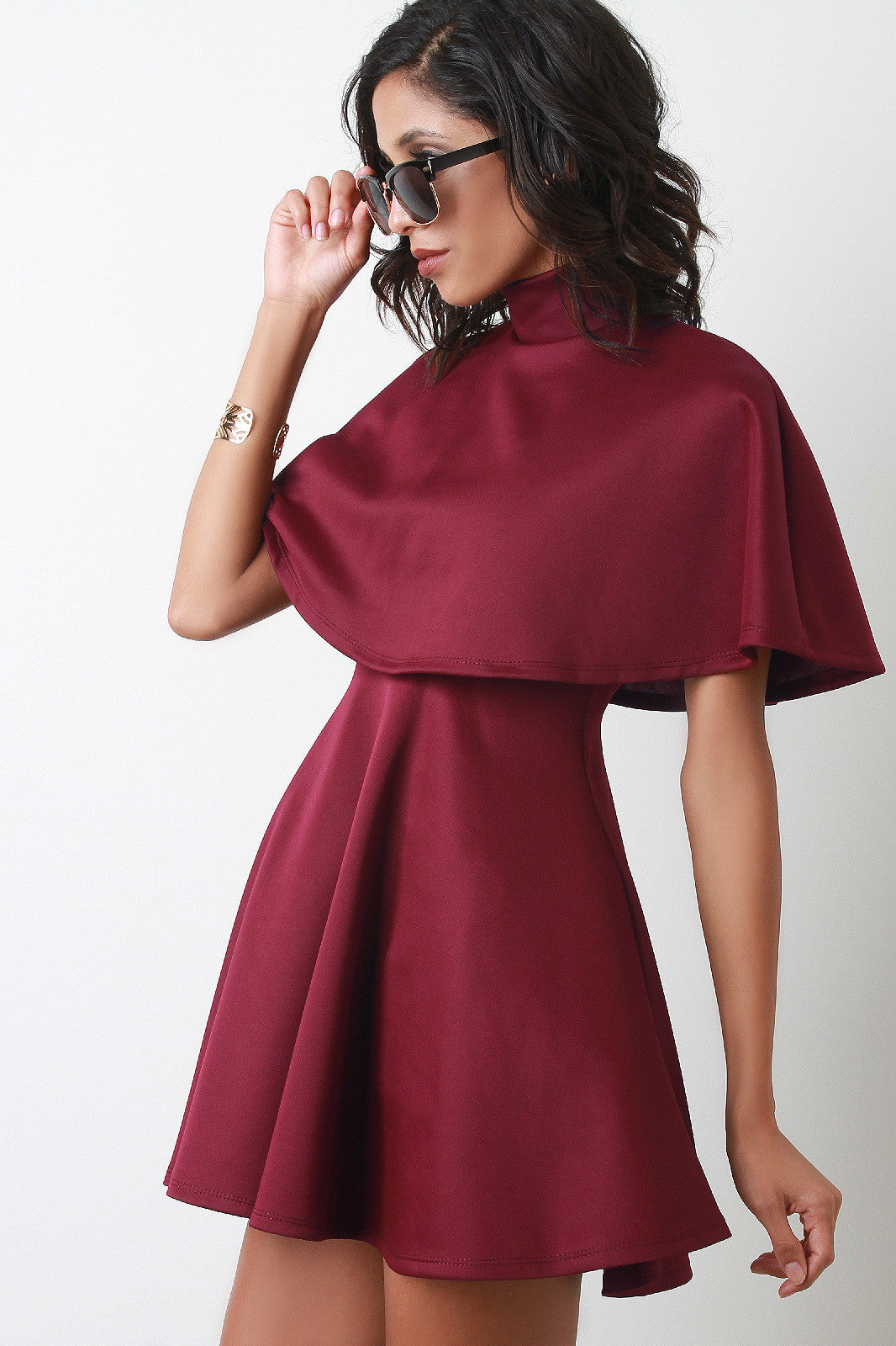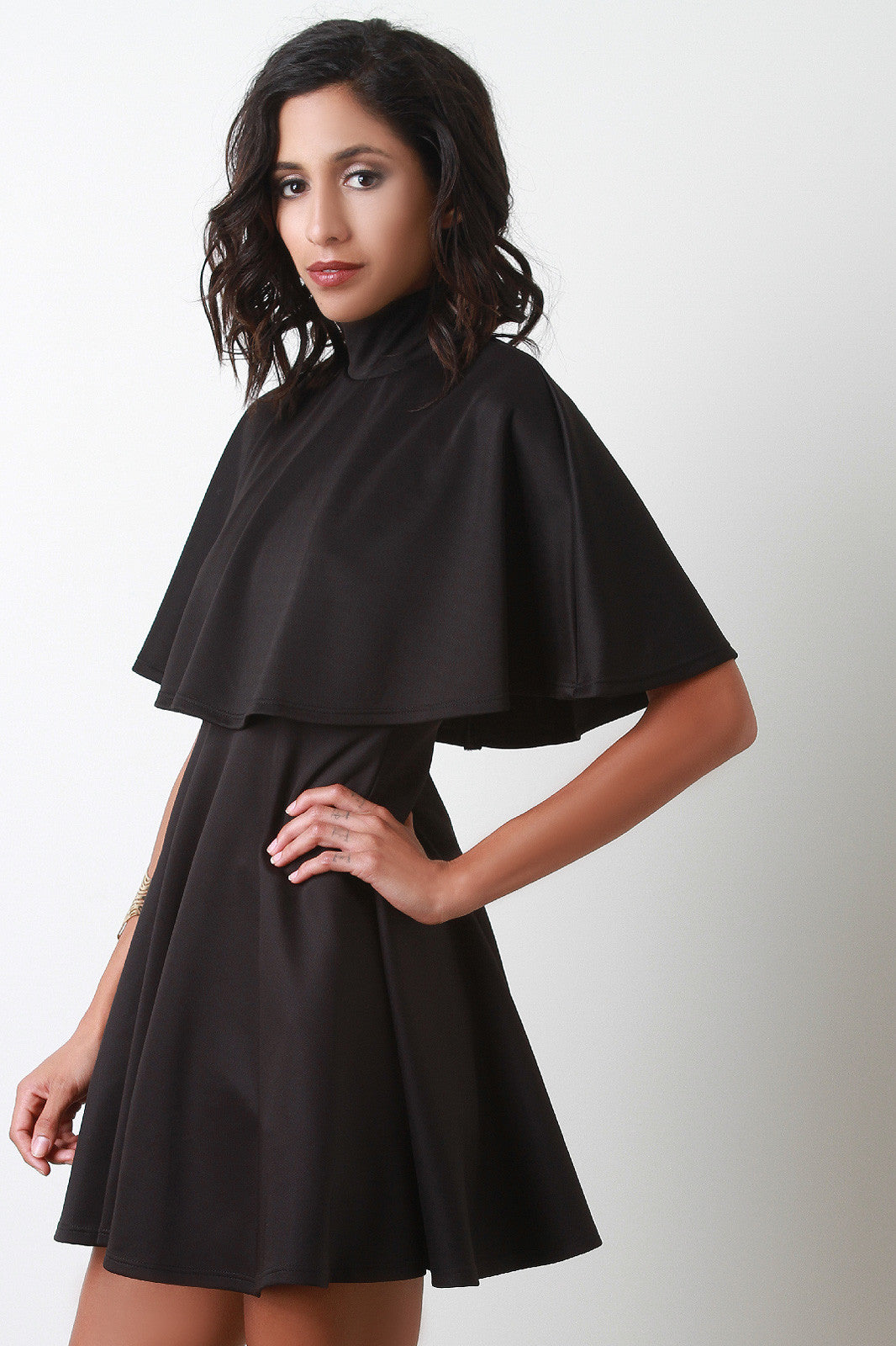 This dress features a cape tier, turtle neckline, keyhole back to a double button closure at nape, flare bottom half, complete with skirt lining and tulle petticoat. Accessory sold separately. Made in U.S.A. 95% Polyester, 5% Spandex.